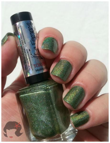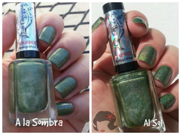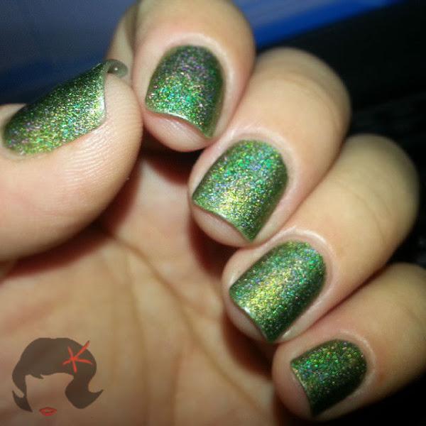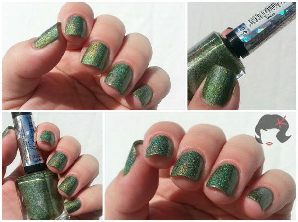 Es un verde que a la sombra no dice mucho (eso pasa con casi todos los holográficos), pero a la luz, ya sea artificial o solar es un Holo disperso precioso que les juro enamora chicas!