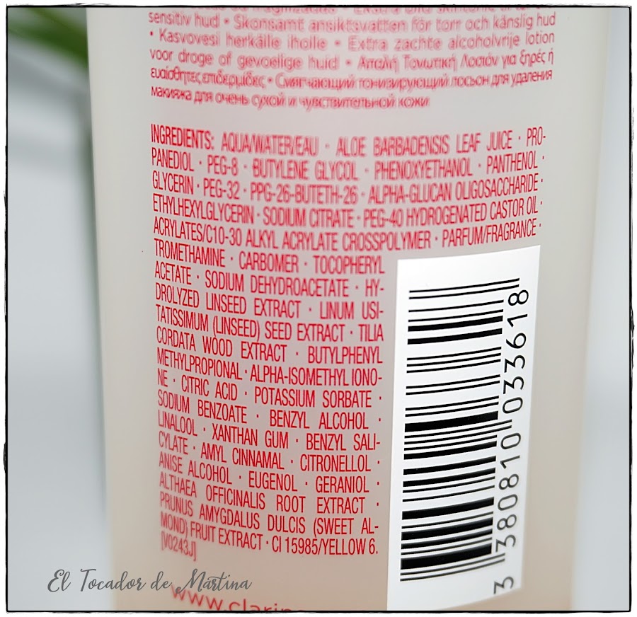 Concrétamente éste de Clarins es muy hidratante y calmante, no contiene alcohol, y el aloe vera es su segundo componente, así que es un pequeño placer para la piel seca/sensible/deshidratada, calmándola y aportándole frescor a partes iguales.