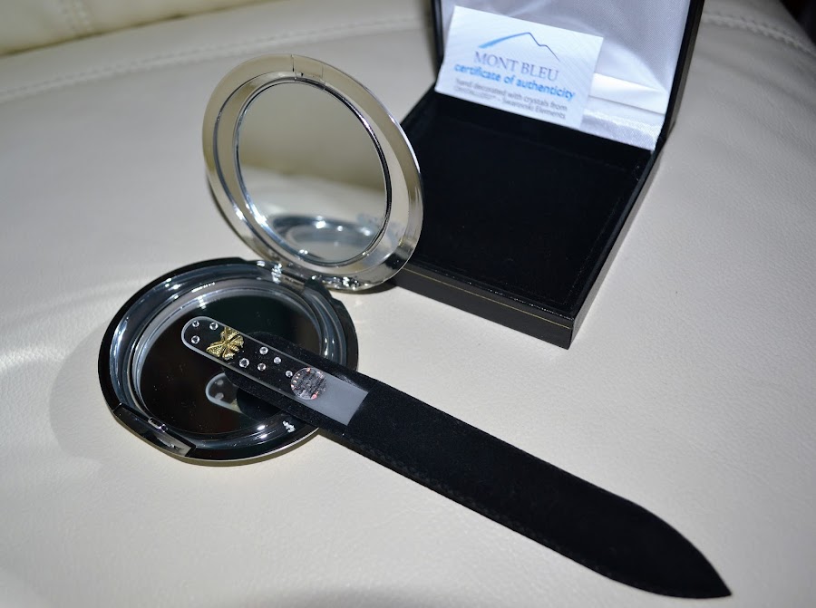 Como veis tanto la lima como el espejo y el cuelga bolsos están realizados con cristales de Swarowski, cuidando los detalles y con un gusto excelente, que convierten estos pequeños detalles en únicos y perfectos.