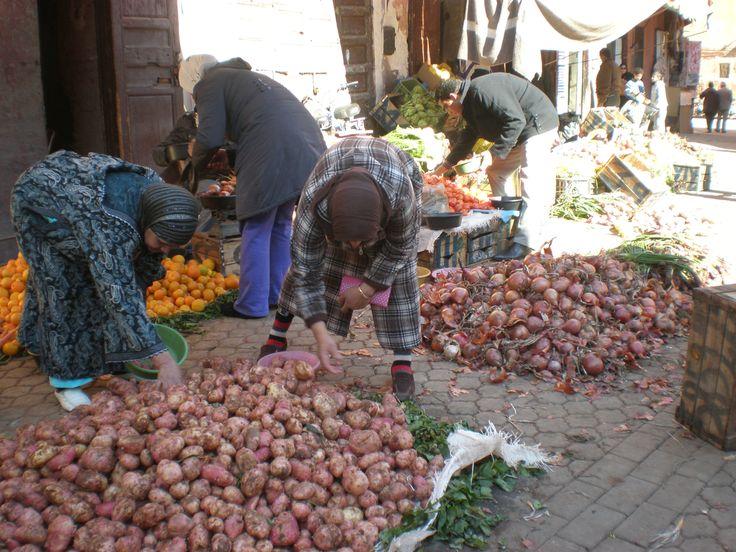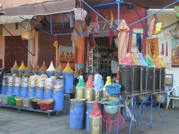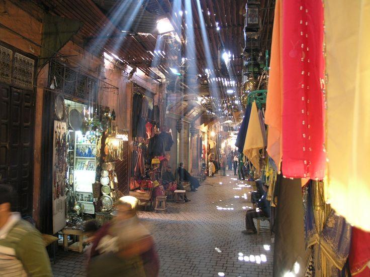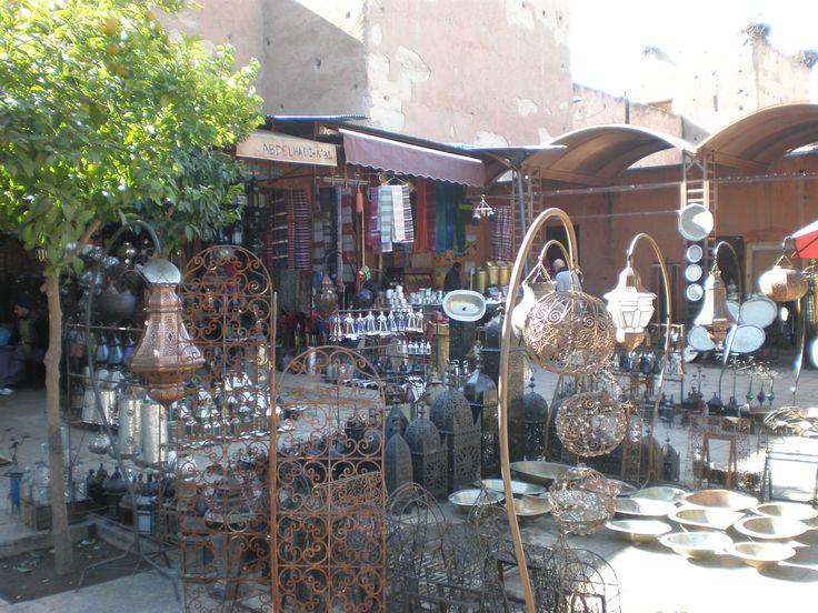 Al norte de la gran plaza de Jemaa el Fna se extiende lo mejor de la medina de Marrakech, un sinfín de callejuelas donde se agrupan los comerciantes y artesanos según sus especialidades. Callejuelas donde encuentras babuchas, tintoreros, pieles curtidas, especias o frutas frescas y verduras. La variedad de productos, colores y olores acaparan todos los sentidos y se extienden por estrechas calles que forman un laberinto donde es fácil perderse. Si preguntas una dirección, siempre tienes a alguien dispuesto a acompañarte hasta el lugar, no intentes disuadirle, es en vano, una vez que has preguntado tienes que aceptar la compañía y dar una propina al final del trayecto. A veces hasta intentan convencerte para que visites otro lugar y no el que quieres ver. Cuestión de intereses.