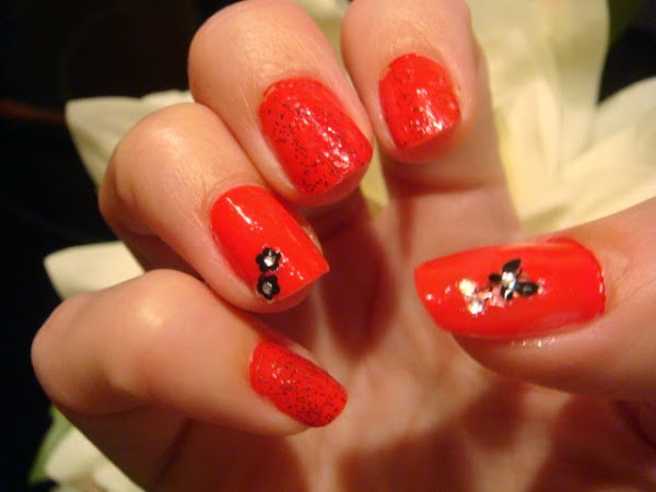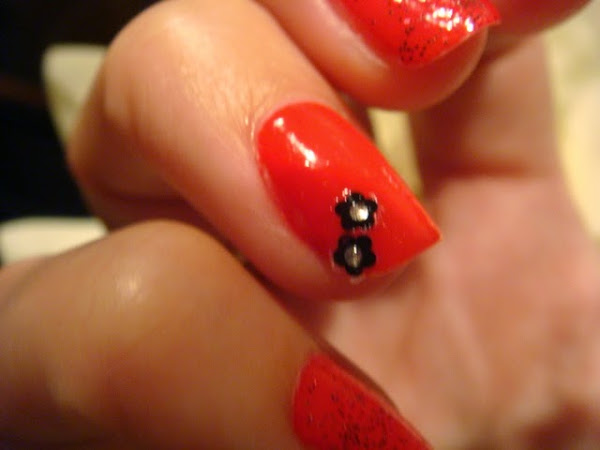 Paso 3.- Aplicamos unos stickers de Essence en los dedos anular (dos florecitas) y en el dedo pulgar (una mariposa). Estos stickers llevan brillantitos que hacen que la manicura quede algo más vistosa.