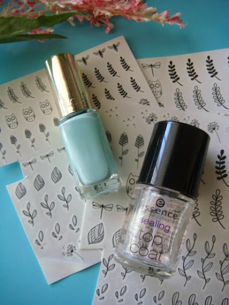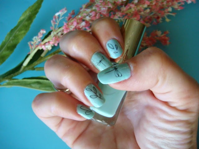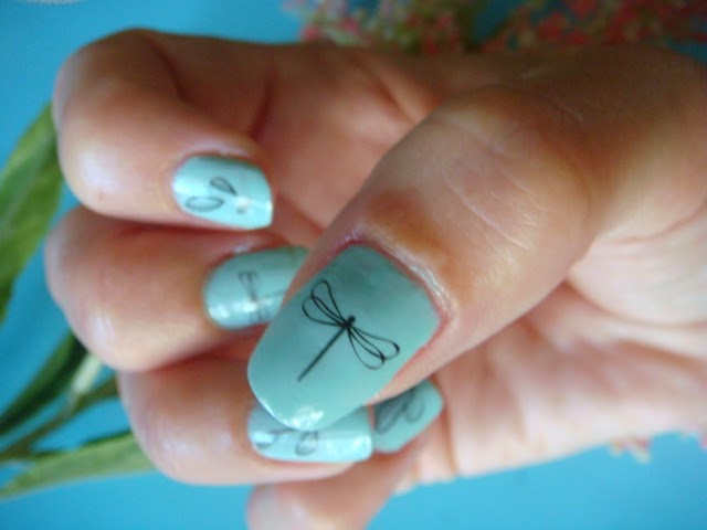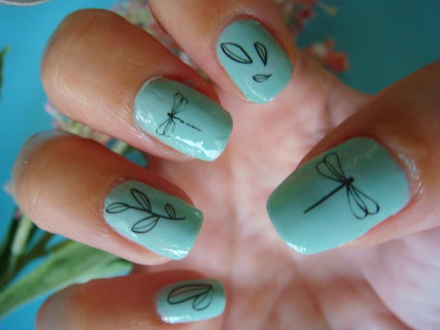 Paso 3.- En este paso he utilizado los Calligraphic Nail Tattoos de Bourjois. En esta ocasión me he decantado por dos libélulas y diferentes tipos de hojas en cada uña. He aplicado una libélula grande en el pulgar, una libélula pequeña en el dedo corazón, y ramitas y hojitas diferentes en el resto de las uñas, dependiendo de su anchura y largura. Son muy fáciles de aplicar, se recorta el dibujo escogido, se separa del plástico protector y se aplica sobre la uña. Después con una toallita o un trapito húmedo se presiona suavemente el tattoo para que se desprenda y quede en nuestra uña. Imprescindible ser muy delicada en este paso.