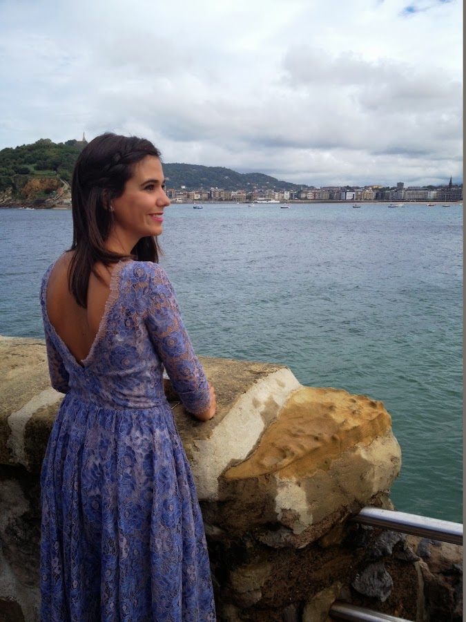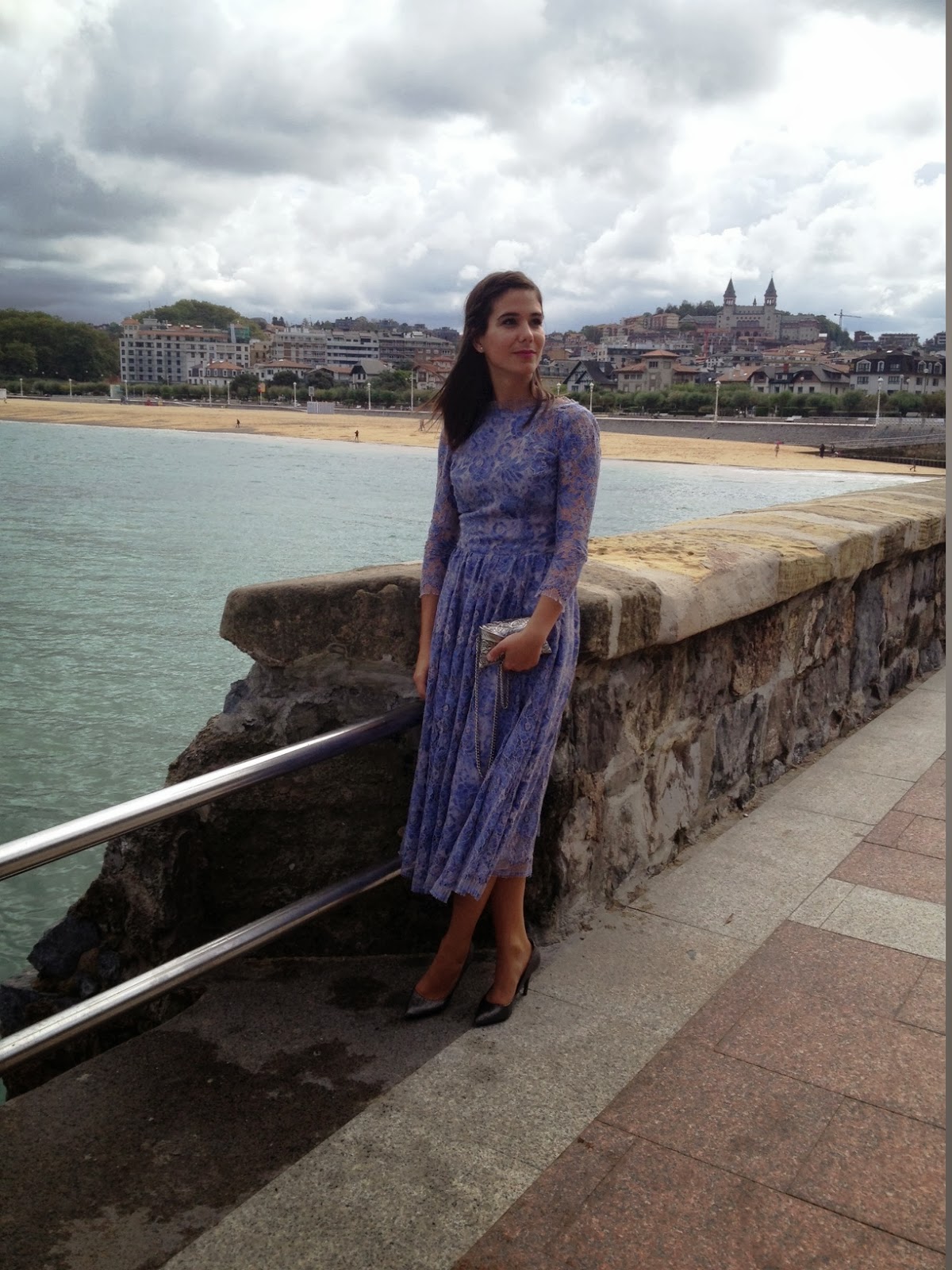 Como la boda era en Donosti en estas fechas, lo vi claro desde el principio: este espectacular vestido de Luisa Beccaria un tanto otoñal y abrigadito de encaje y con una largura por debajo de las rodillas.
