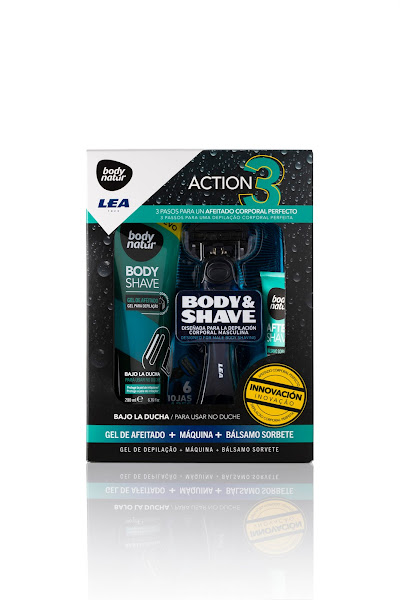 El pack ACTION 3, que incluye la máquina con cabezal doble de seis hojas de LEA, el gel de afeitado corporal y el bálsamo sorbete post-afeitado de Body Natur,