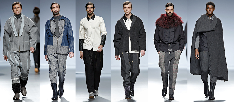 El hombre de Roberto Verino es un hombre elegante con una gama cromática del gris al negro, se destaca con una lineas degradas en los pantalones de toda la colección , abrigos en piel y pelo para el frío invierno.