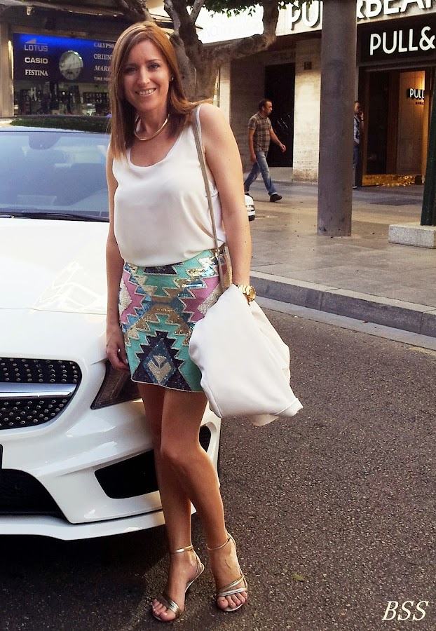 Blazer, top y collar de Mango, falda joya de una tienda local