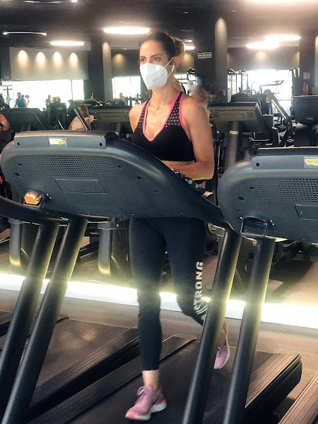 La verdad es que nosotros vamos muy tranquilos a entrenar y además nos preocupamos mucho de cumplir todas las normas. Si bien en las máquinas de cardio uno puede quitarse la mascarilla mientras las está usando (es horroroso intentar hacer deporte de esfuerzo llevando una mascarilla, no sé si lo habéis probado), como últimamente lo que yo hago es andar en la cinta -os lo conté hace unas semanas- me puedo permitir dejarme la mascarilla puesta. Reconozco que sólo me la quito para algunas fotos, y a veces ni eso . Aunque a veces me suda un poco el bigote, eso sí... Luego, me voy a la zona de pesas y sigo llevando mi mascarilla, que sólo me quito unos segundos para beber agua. Y, por supuesto, limpio la cinta, las pesas y las máquinas después de usarlas, como hace todo el mundo que veo en el gimnasio.