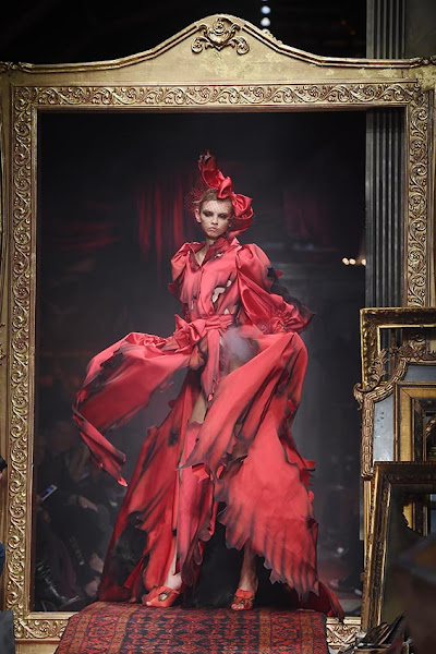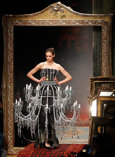El jefe creativo de la firma Jeremy Scott, transformó la paralela en un piano bar consumido por las llamas y por él desfilaron las modelos con vestidos quemados, lamparas a modo de polisón, teclas de piano como adorno ....... ¡Un derroche de creatividad!.