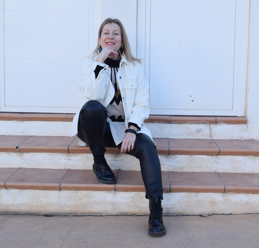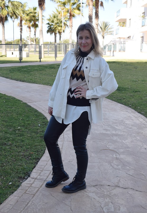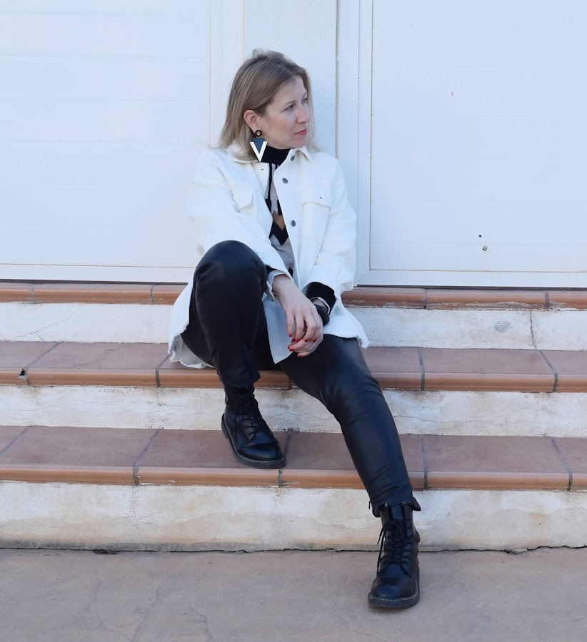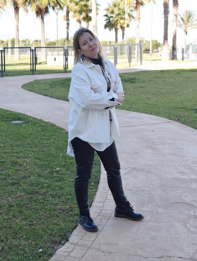 En este caso, una sobre camisa regalo de Reyes, en color crudo y micropana, a la que estoy sacando mucho partido. Hoy con un look básico, con pantalón de polipiel, botas militares (que por cierto casan muy bien con las sobrecamisas), y capas de body, blusa y jersey por encima.