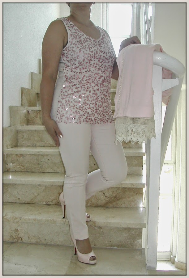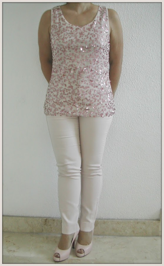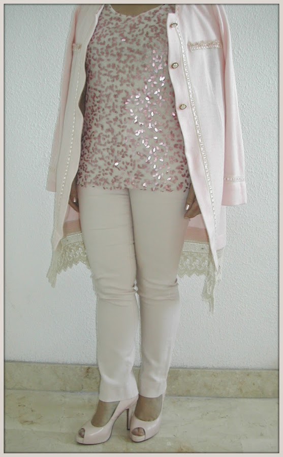Para esta ocasión, he combinado un pantalón pitillo, con una camiseta con pequeñas lentejuelas en un tono de rosa un poco más subido, y un abrigo de aire romántico.