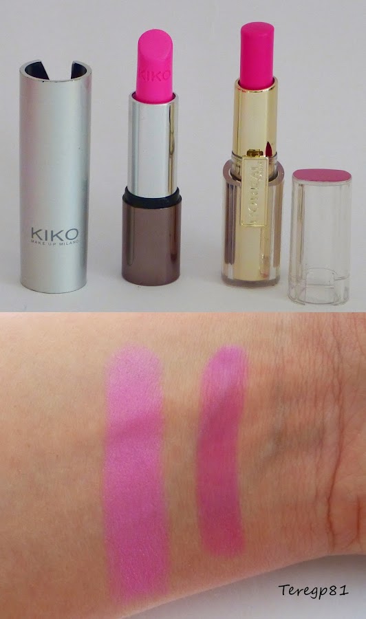 4. KIKO: No puedo deciros el tono porque no aparece en el labial. Es de los que hay que pulsar la parte superior de la tapa para que baje el labial y poder sacarlo. Aunque es más claro que los anteriores es cubriente, de acabado brillante y muy llamativo.
