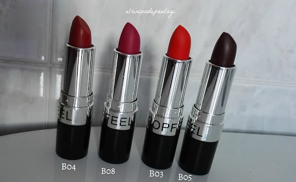 Los tonos son iguales al labial, excepto el B04 que en la mano parece un rosa, y en la barra parece un burdeos. No me disgusta, pero no me esperaba que fuera otro tono diferente...