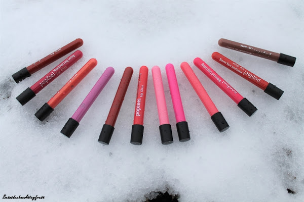 Estos que os enseño hoy podemos dividirlos en tres gamas de colores, los tonos rosados desde el más apagado al más fuerte, los tonos rojos pasando por el burdeos y los marrones, desde el más claro nude al más oscuro. 100% recomendados por su duración, forma de aplicación con pincel y tamaño ideal para llevar en el bolso y retocarse en el caso de que se precise, pues su larga duración nos dejara con labios perfectos durante horas, incluso después de comer o tomarnos algo.