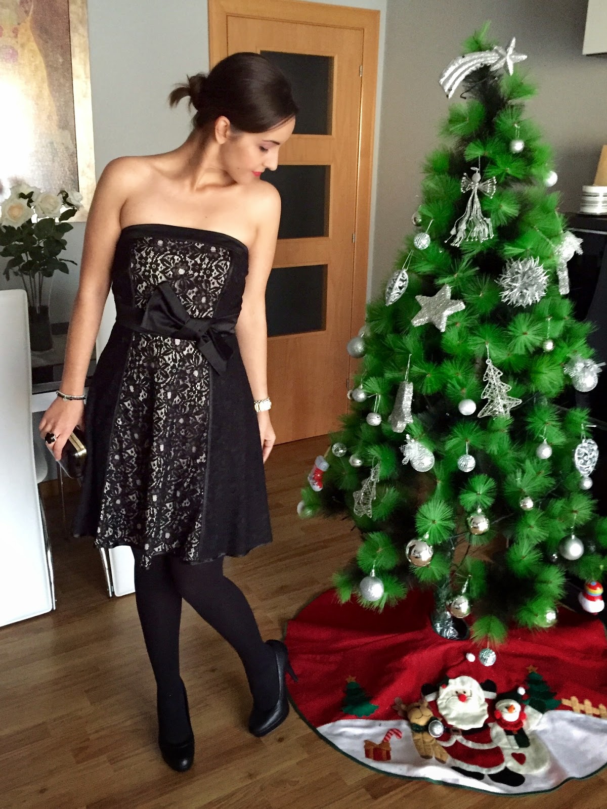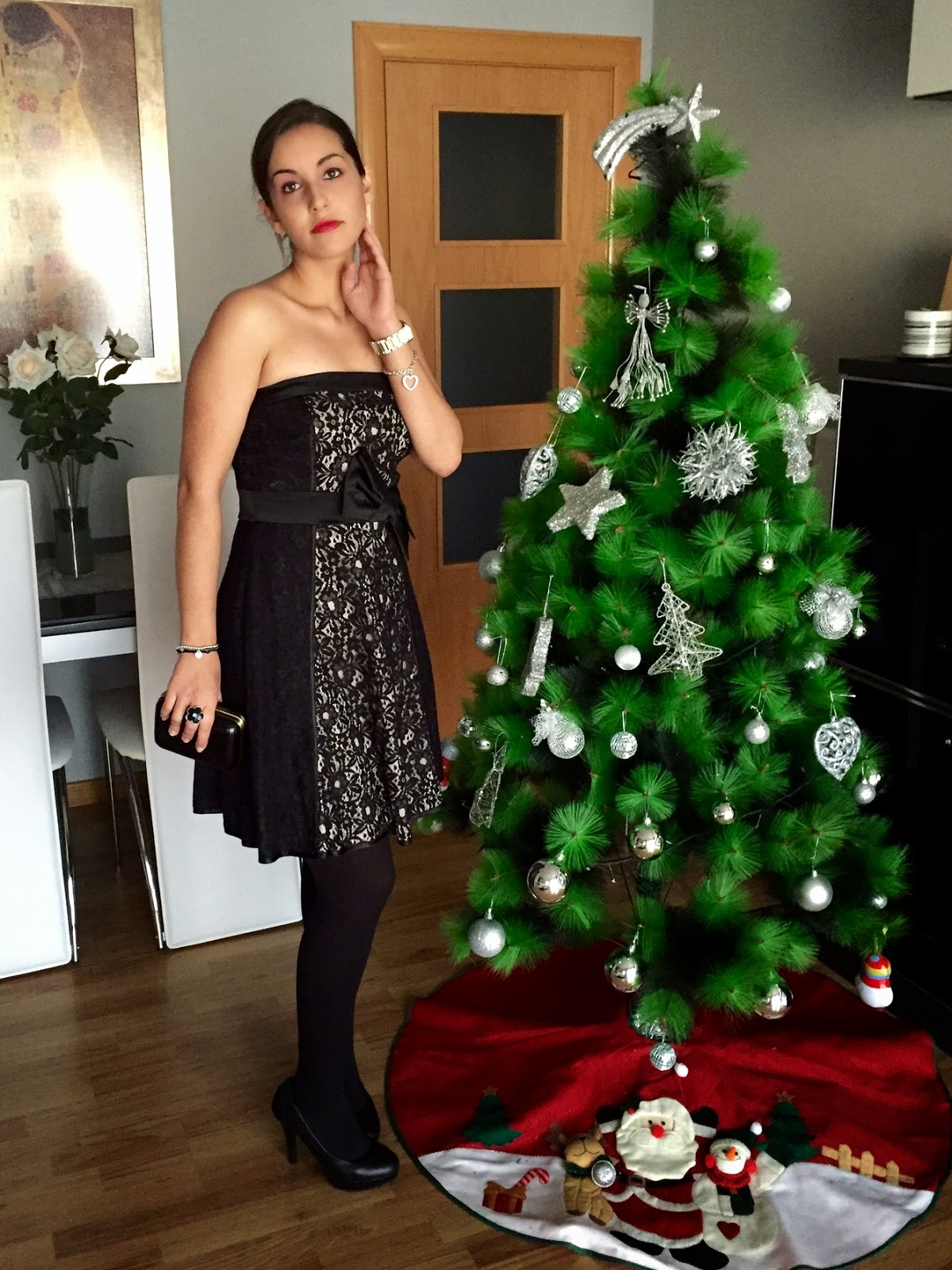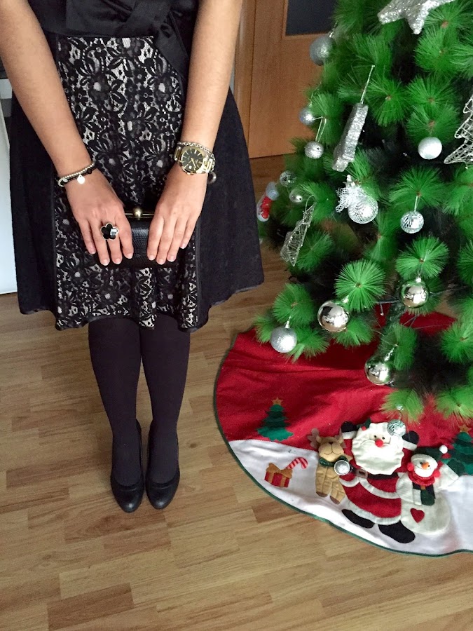 Now, let"s talk about the outfit of the day. This outfit is perfect for wear it in New Year"s Eve. In the outfit I wore a lace dress, black stilettos and a black hand bag. To give a chic touch to the outfit I did a small topknot.