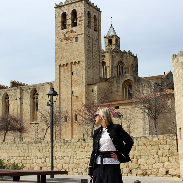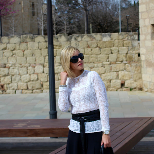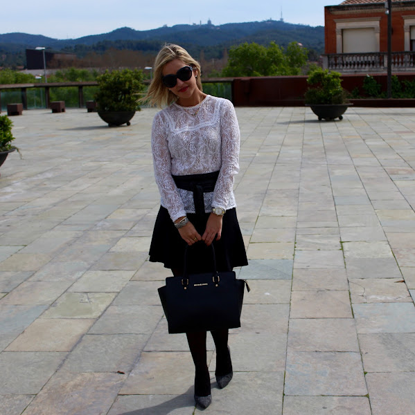 Hoy os enseño un look que me encanta, me parece super dulce y femenino. En el look de hoy llevo una camiseta blanca de encaje que combiné con una falda negra tipo skater y mi chaqueta estilo marinero, que ya os enseñé en este post. Para darle un toque al look le añadí un cinturón tipo fajín, mis stilettos y mi bolso Michael Kors. Un look elegante y que puede funcionar para cualquier ocasión.
