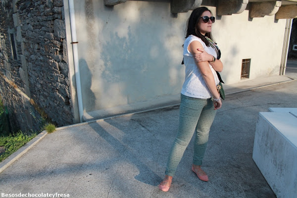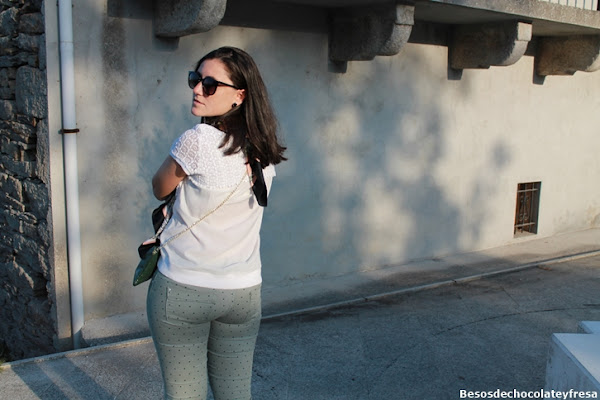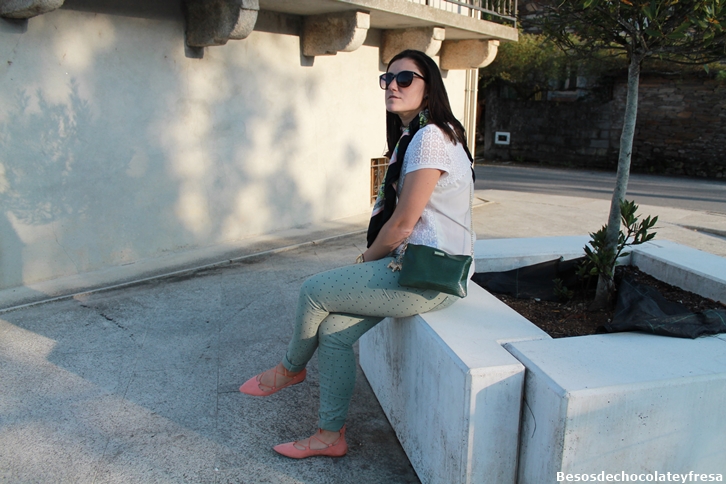 Hoy os muestro un look atrevido en colores verde, coral y blanco. Llevo camiseta troquelada en blanco de manga corta con jeans de topos en verde y como complementos lace-up en coral en contraste con el resto de colores, bolso en verde y chaqueta milita.