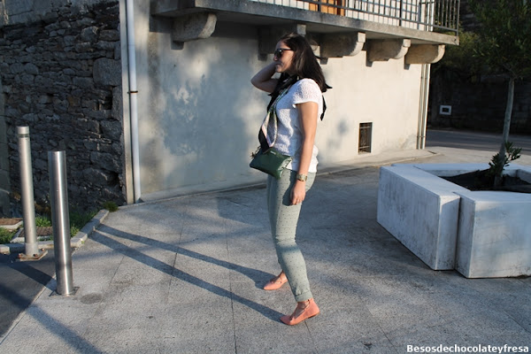 Today I show a look bold in green, coral and white. Ive been punched in white T-shirt with jeans and green polka dots and lace-up accessories in coral in contrast with the other colors, green and militates bag jacket.