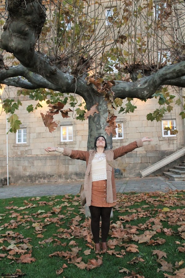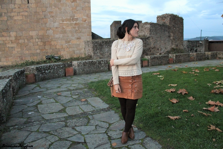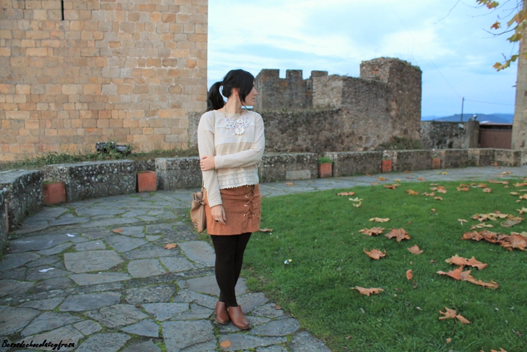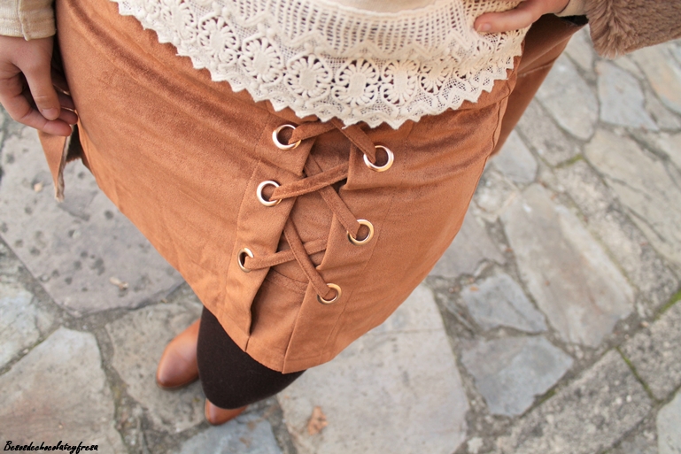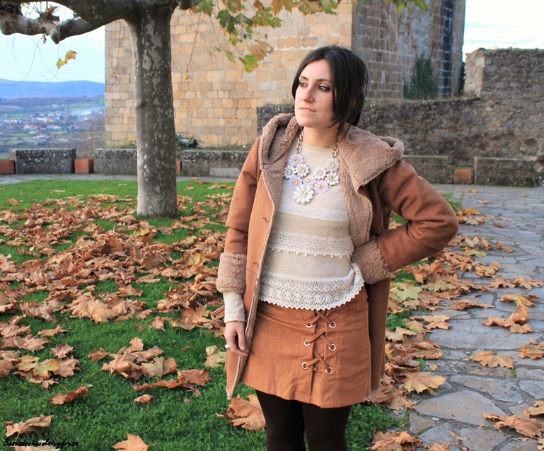 For this occasion I decided to release my new lace-up Rosegal skirt that I received a couple of days ago and that can not be more comfortable and versatile. From antelina in dark brown and the detail of the lateral lace-up, it has it all. Complete the look with nude sweater and flower necklace to make some contrast, brown stockings, booties and plush overcoat. A total brown look. What do you think?
