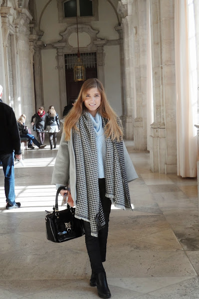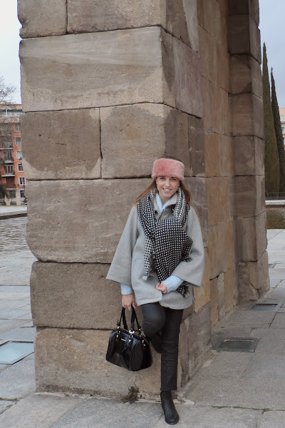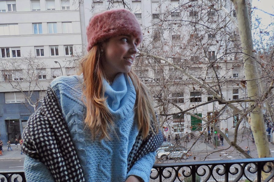 Para ese día elegí un look abrigado y cómodo, sin renunciar al estilo. Opté por pantalones de cuero, que siempre abrigaran más que el clásico vaquero. Una manía que tengo con este tipo de pantalón es que me gusta que se aprecie en su totalidad, así que siempre que me lo pongo prescindo de las botas altas y lo combino con zapato más bien bajo (en este caso, los botines del post anterior). Lo combiné con jersey azulito, calentito y comodísimo. El abrigo y la bufanda los elegí en tonos neutros y terminé el look con uno de mis "must" de este invierno: un adorno en el pelo (cualquier tipo de gorro, cinta o bandana que te guarde del frío en la cabeza será bien recibido en mi armario).