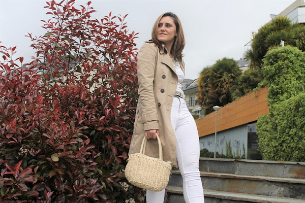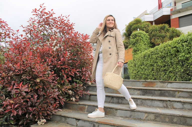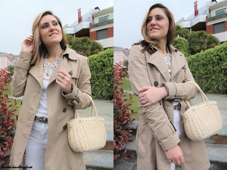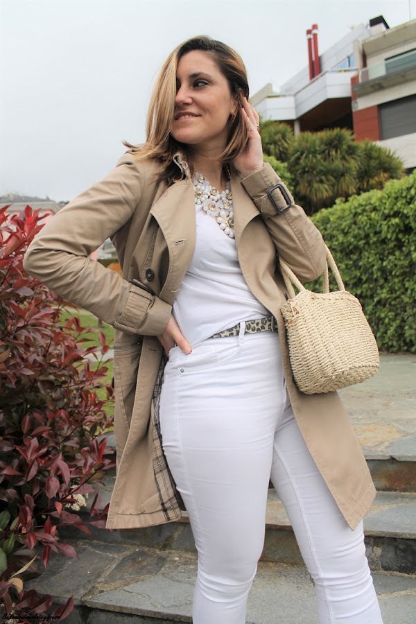 En el outfit de hoy lo llevo junto con prendas en color blanco como son unos jeans skinny, camiseta básica donde el collar le da todo el toque chic y lo eleva al máximo en los mismos tonos que la gabardina.