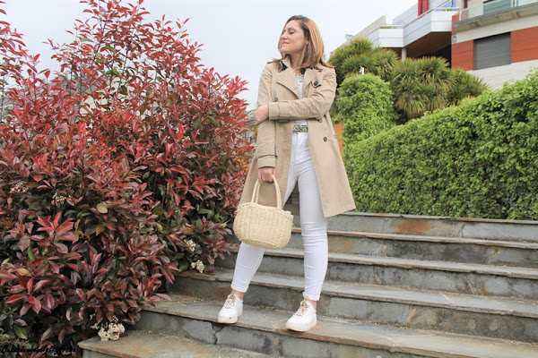 Sneakers en blanco con cordones dorados, cinturón animal print para salir de la monotonía y del monocolor y capazdo de rafia.