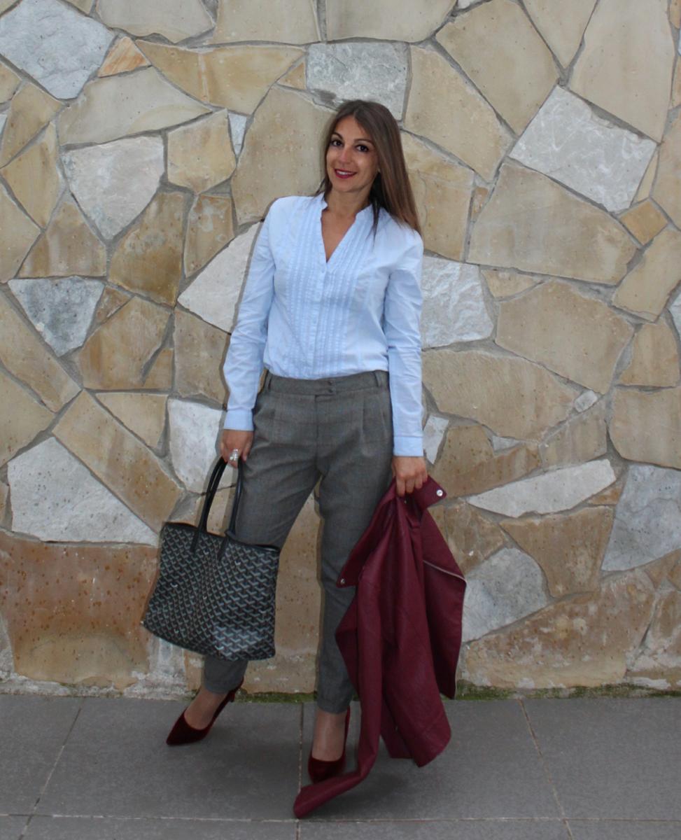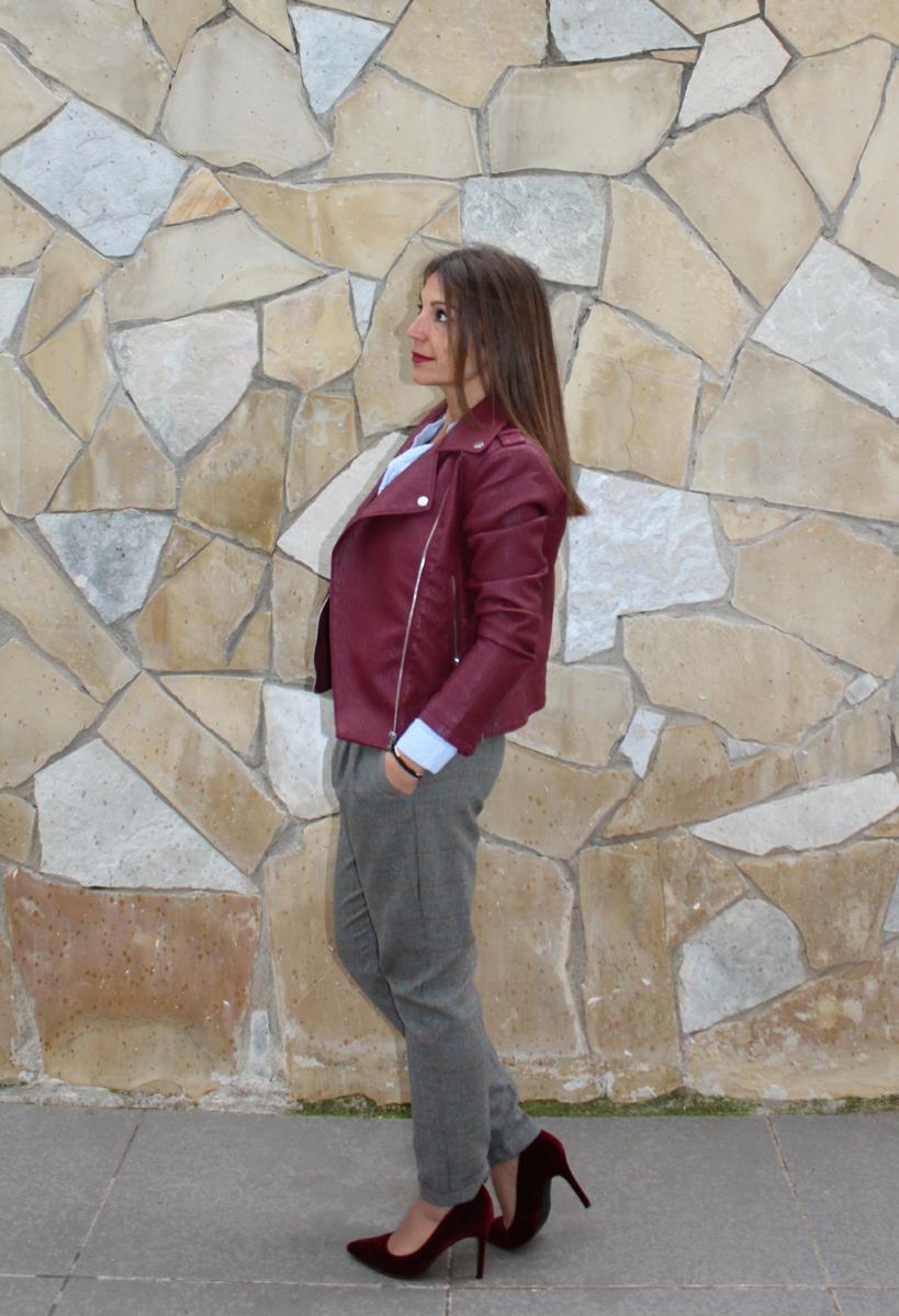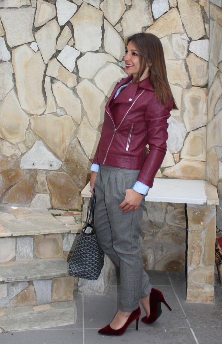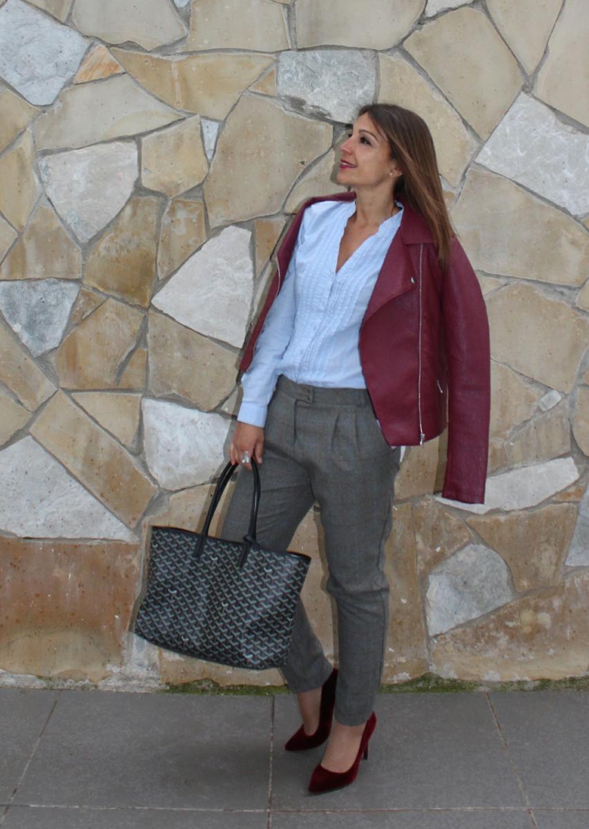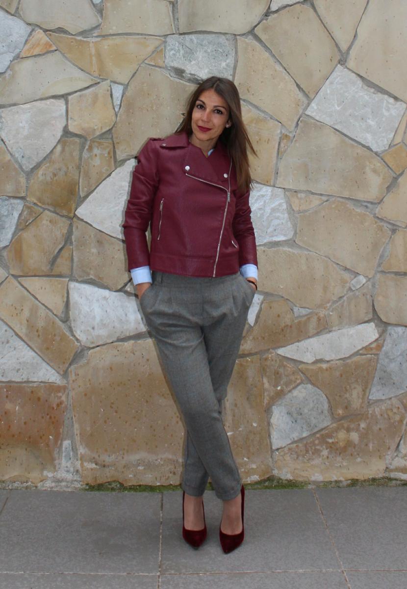 En mi look de hoy he elegido un pantalón de pinzas, con corte recto en estampado de cuadros con unas sutiles lineas en azul y granate, colores que he usado como base para el resto de prendas. Camisa en tono azul cielo y burgundy o granate para la cazadora tipo biker y los zapatos de terciopelo.