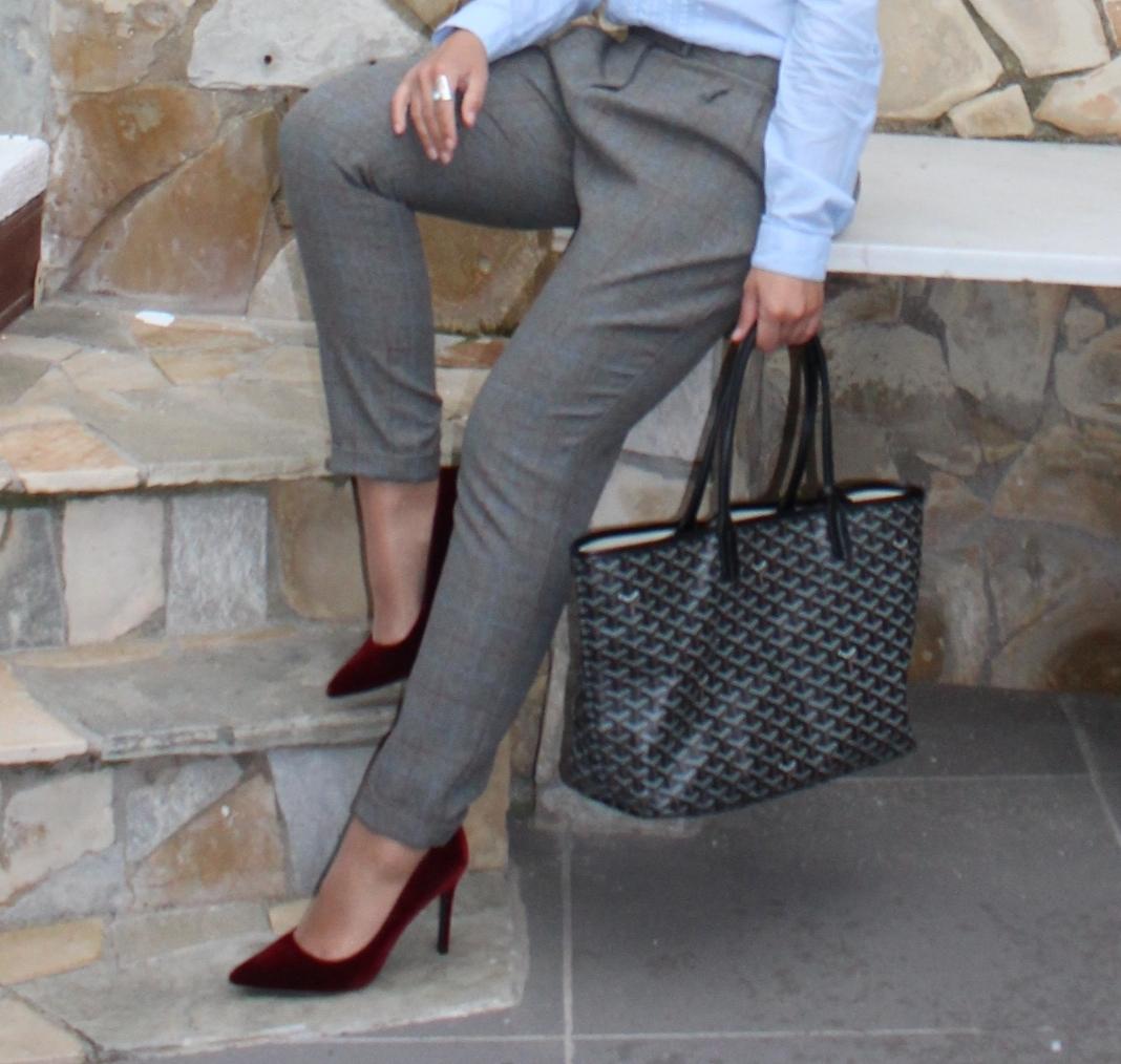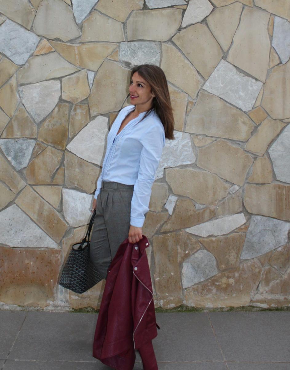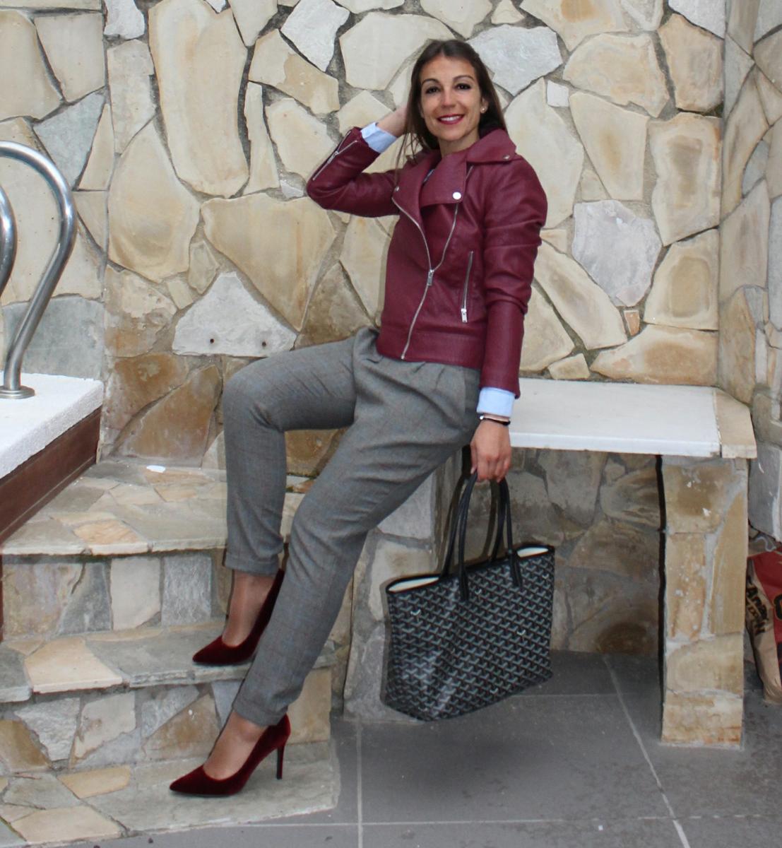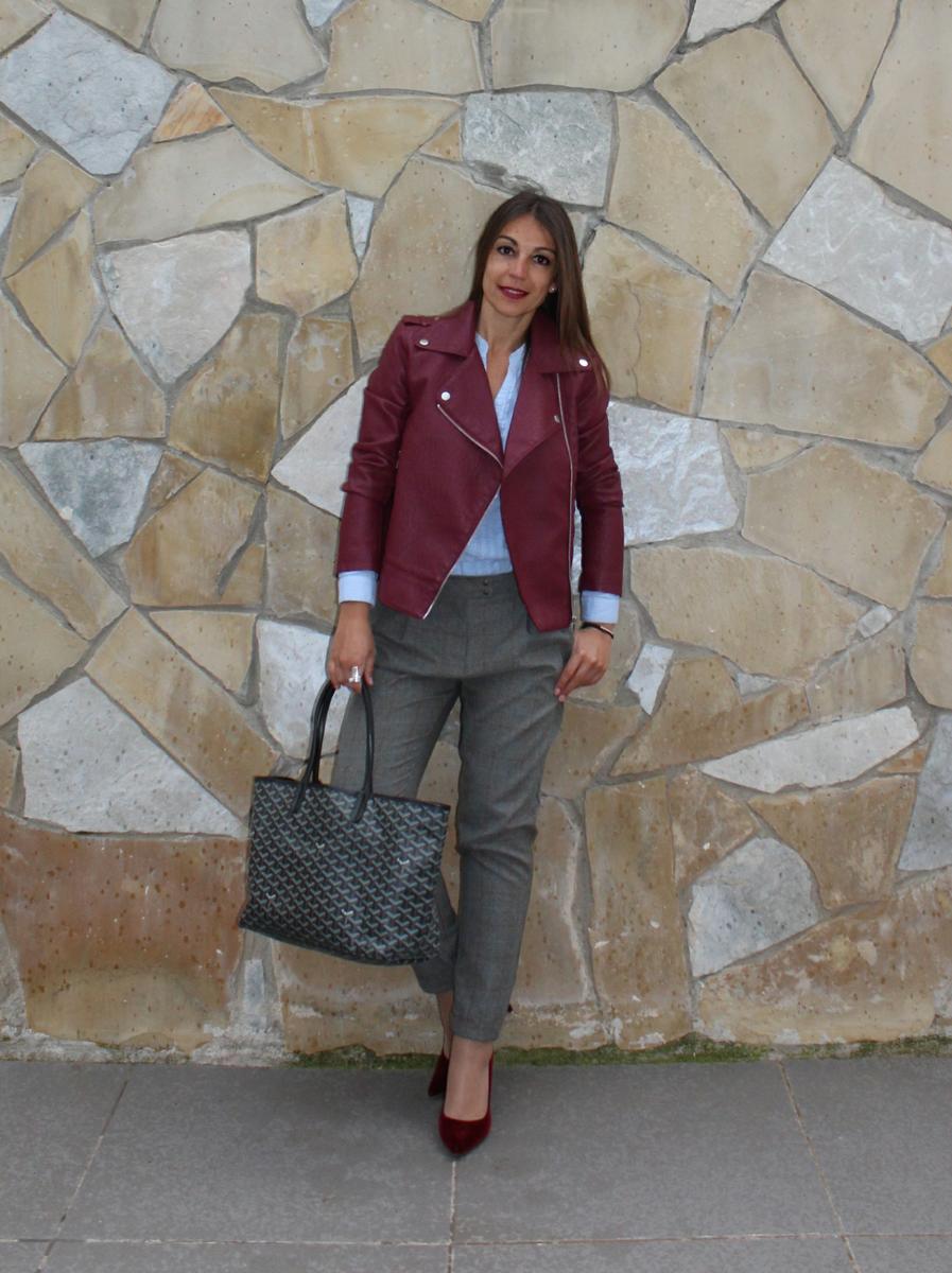 En mi look de hoy he elegido un pantalón de pinzas, con corte recto en estampado de cuadros con unas sutiles lineas en azul y granate, colores que he usado como base para el resto de prendas. Camisa en tono azul cielo y burgundy o granate para la cazadora tipo biker y los zapatos de terciopelo.