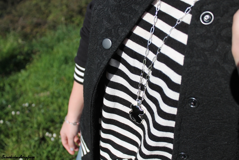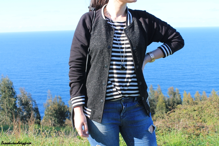 This time wearing jeans with black striped shirt and bomber, in black suede bag, Tous Bear necklace and sneakers.
