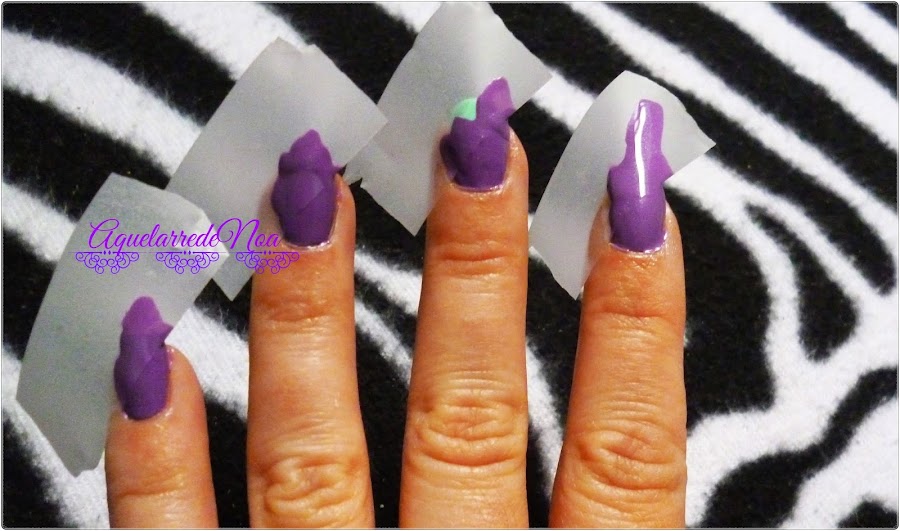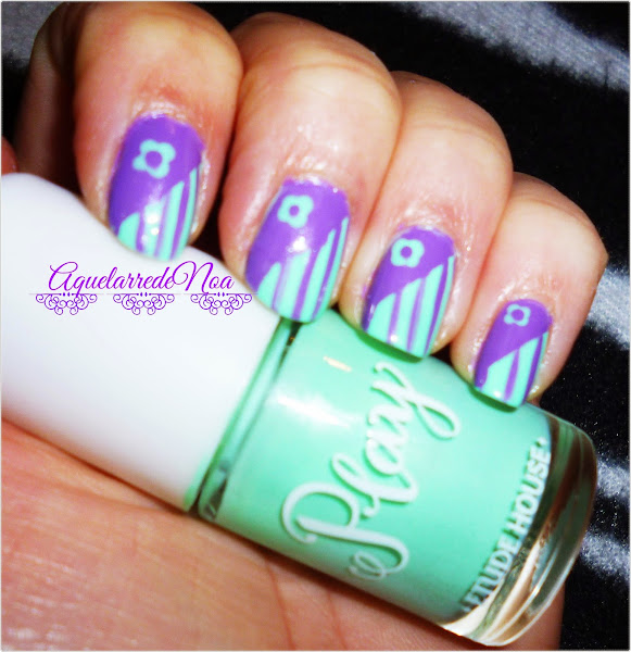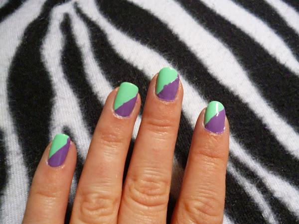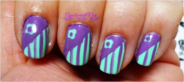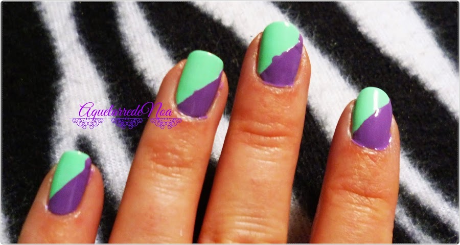 Este seria el aspecto que tendriamos despues de pintar las mitades. Ahora con un pincel fino y largo hacemos líneas verticales en el color lavanda que salgan desde este hacia el extremos de la uña por el lado menta.