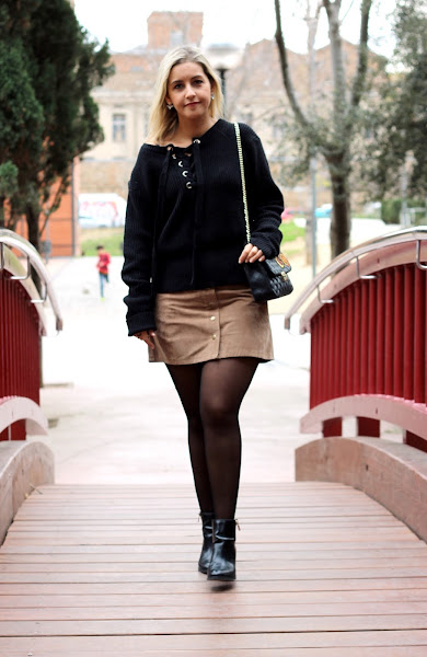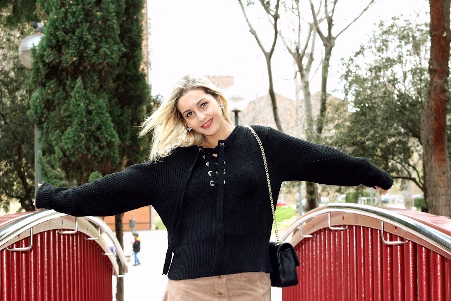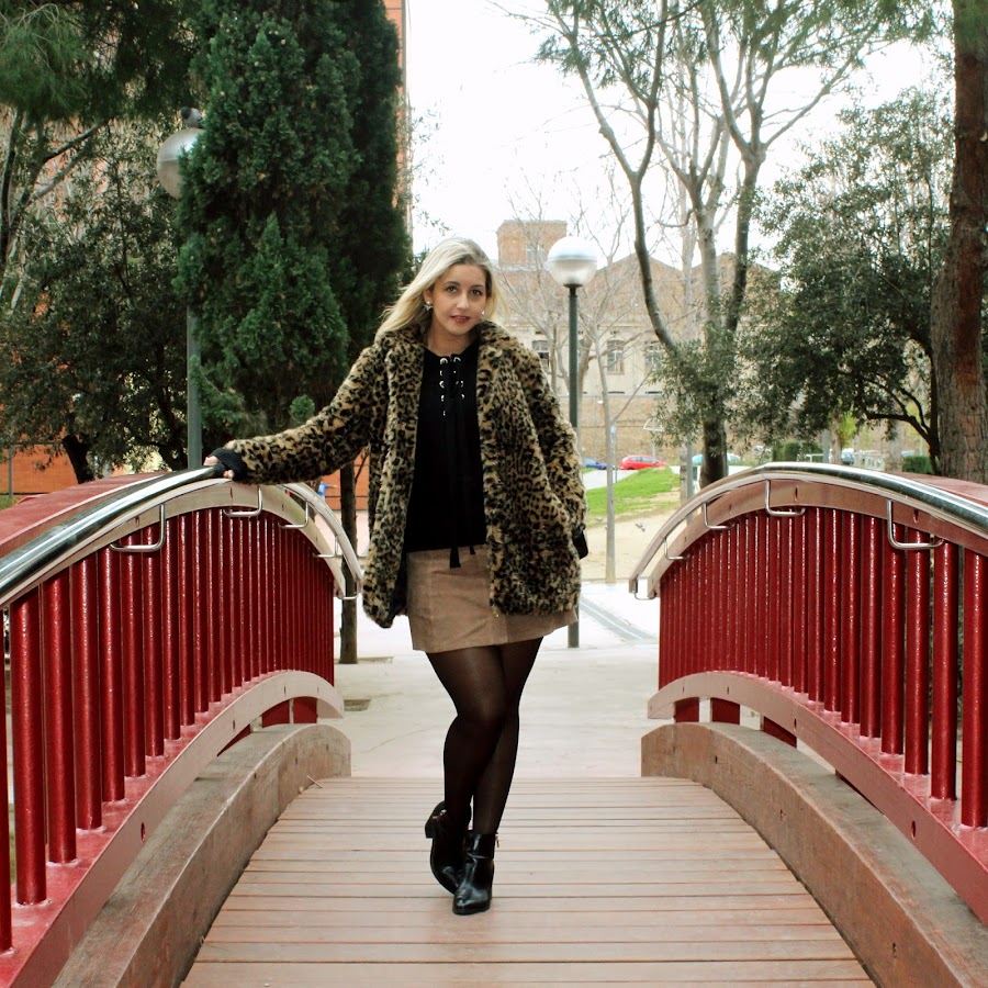 Hoy os enseño mi nuevo jersey negro con cordones de Rosegal, que combiné con una falda de antelina con botones y mi nuevo abrigo de leopardo, que se ha convertido en mi nueva obsesión. El resto de accesorios del look fueron mi botines negros de Stradivarius y mi bolso negro con parches de Zara.