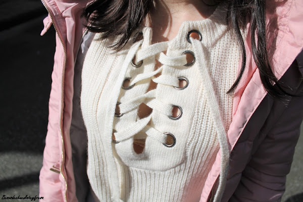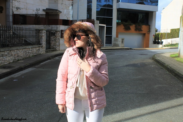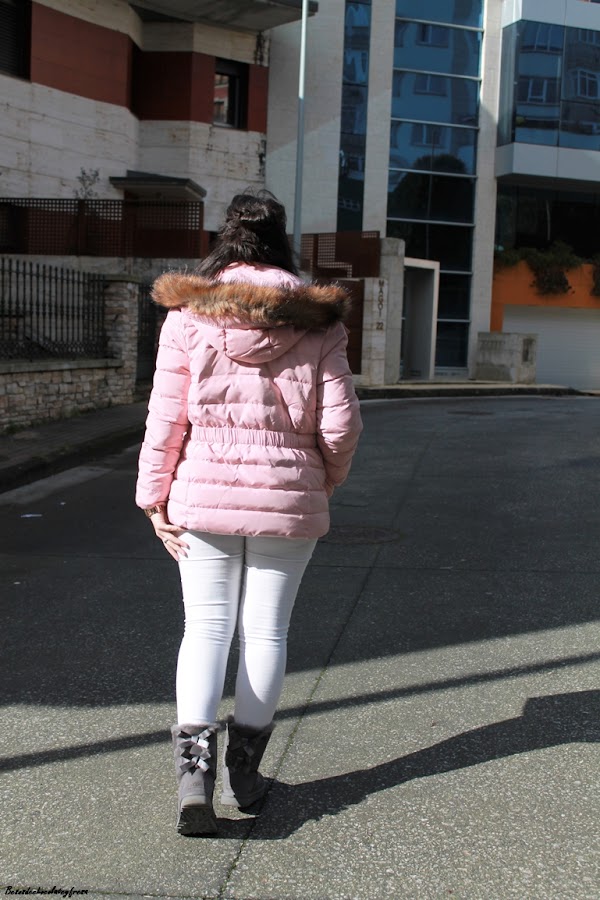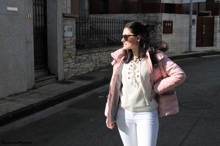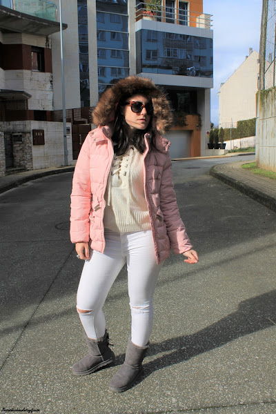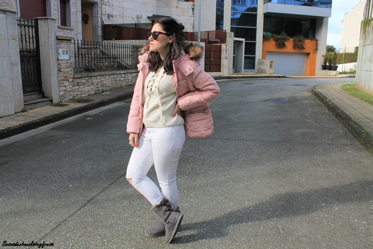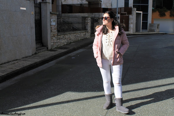 Completo el look con jeans blanco rotos, botas en gris y plumífero en rosa bebé con capucha de pelito. ¿Qué os parece? ¿Teneís alguna prenda lace-up?