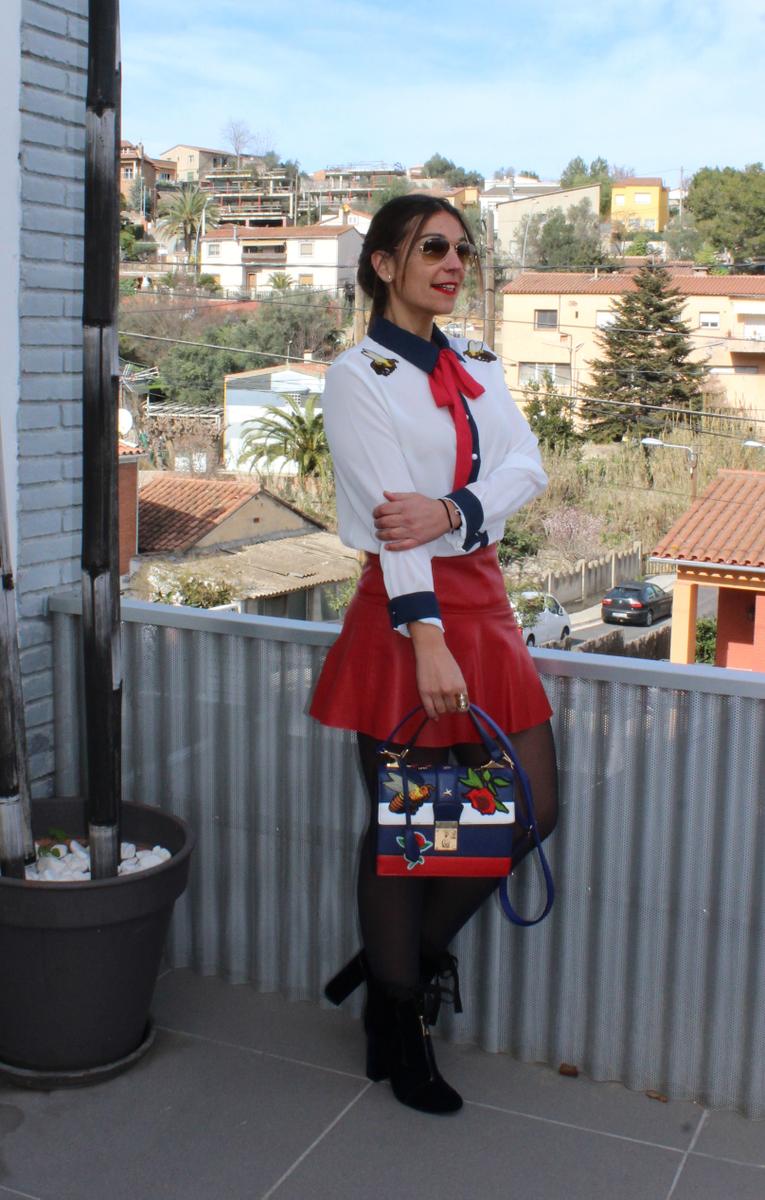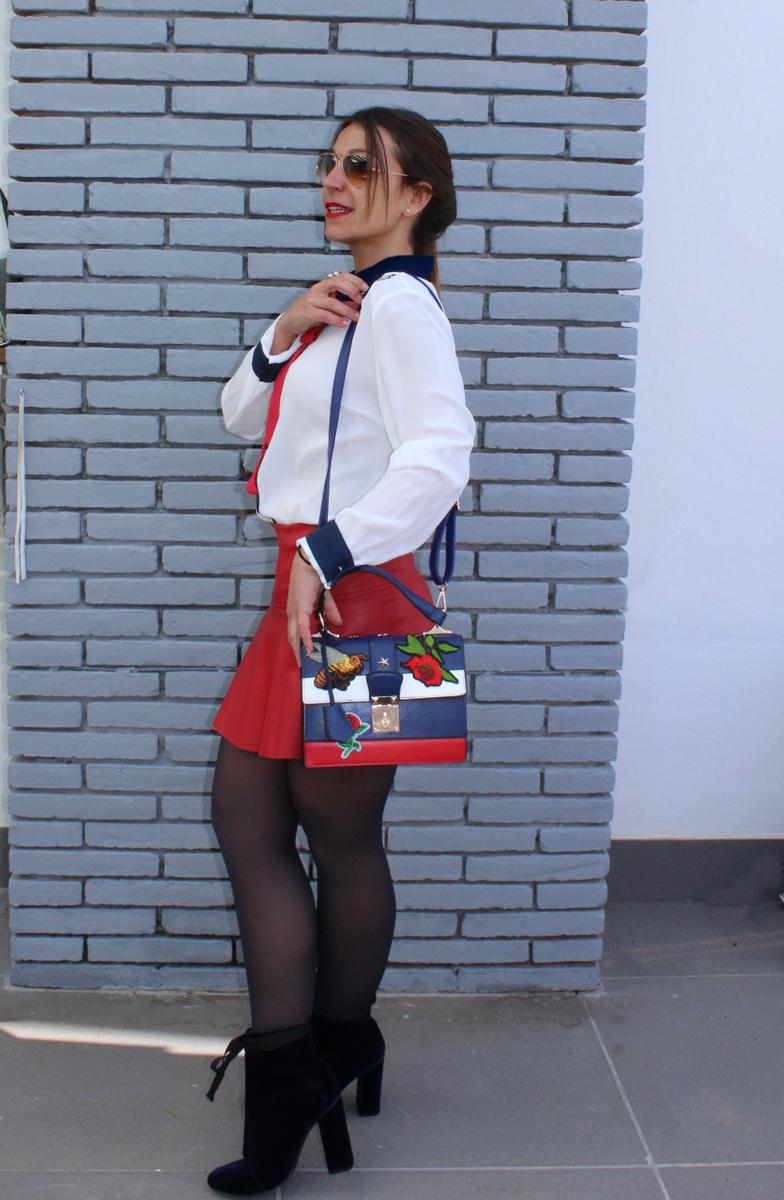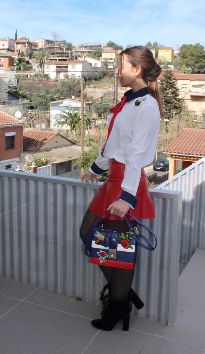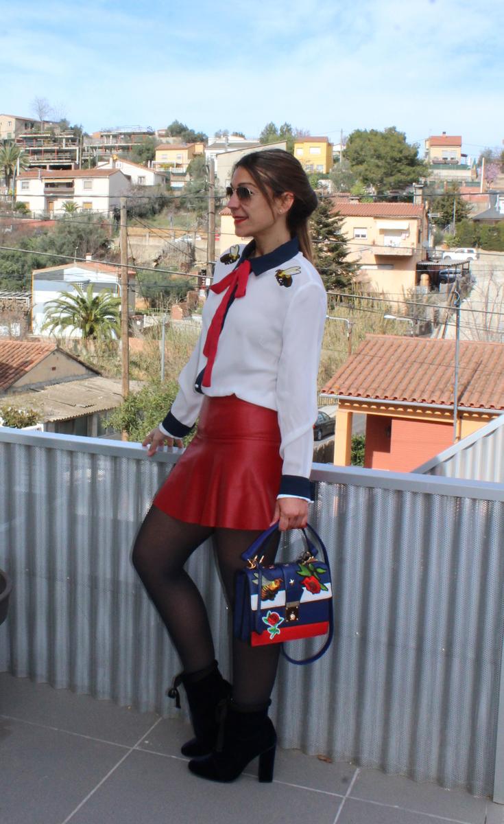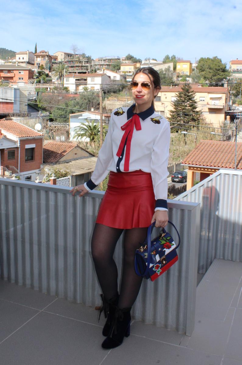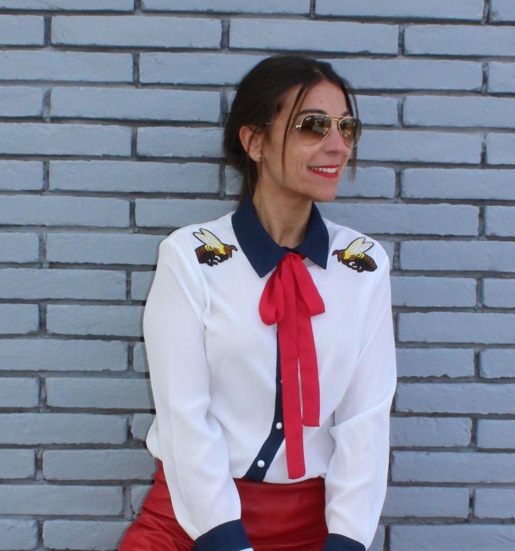 En mi look de hoy elegí una de la marca Shein , que no sólo me encantó por el lazo en color rojo que destaca sobre el blanco, sino que reúne unas cuantas tendencias en una misma prenda. Por un lado los bordados, que si hasta ahora habían sido flores, flamencos, tigres….ahora le toca a las abejas que adornan los hombros de esta bonita camisa y que además también aparecen en el bolso con la que lo combiné. Otro detalle que también me gusto mucho fue que tanto el cuello, puños y cierre de la camisa son de color azul, elevando más el contraste del lazo rojo y como botones unas bonitas perlas.