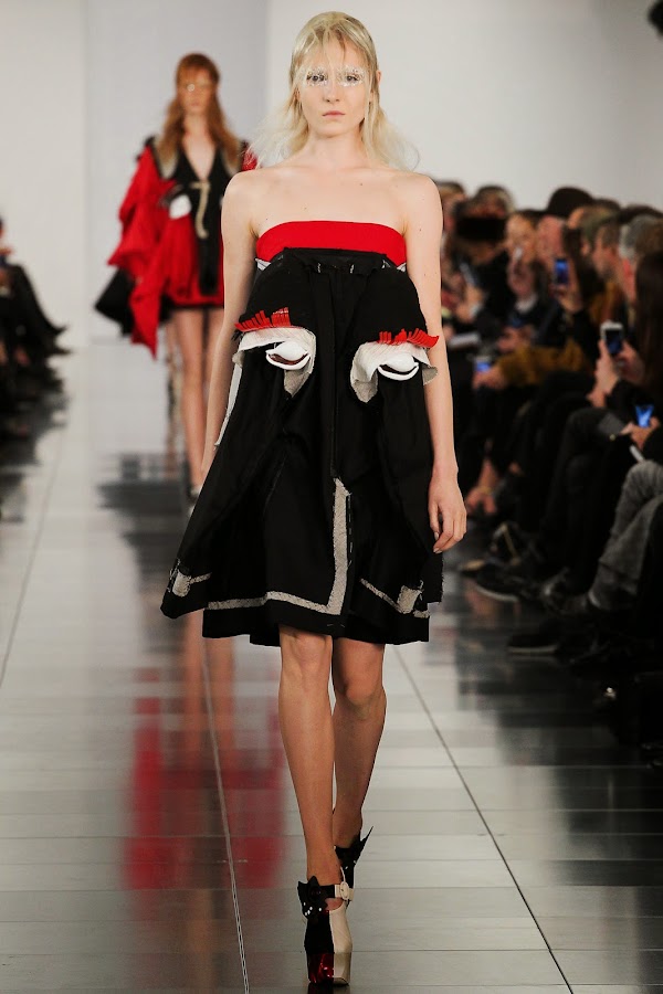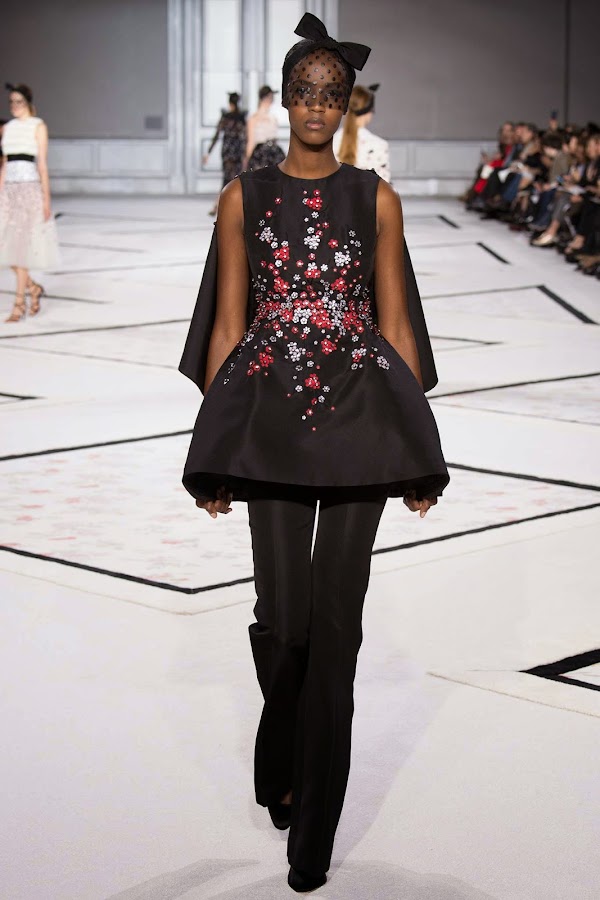 Giambatista Valli crea lo que podría ser una camisa, ya que me parece cortísimo para ser un vestido. Le pondría unos centímetros más y quedaría un LBD original y muy elegante (la capa se la dejo que me ha encantado).
