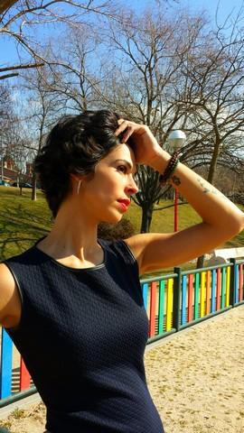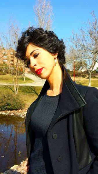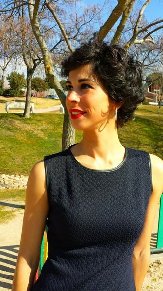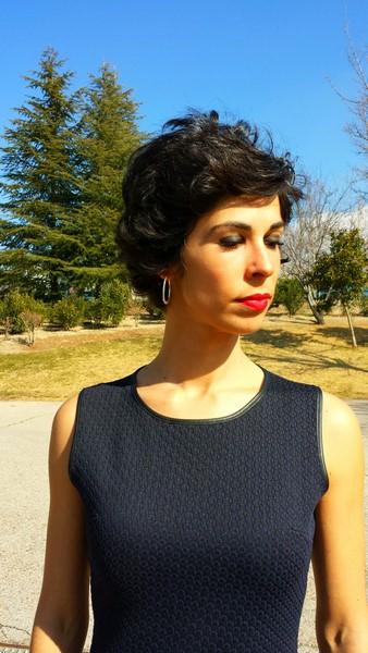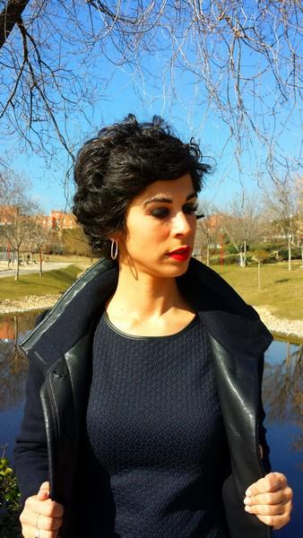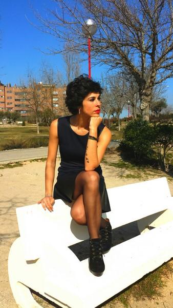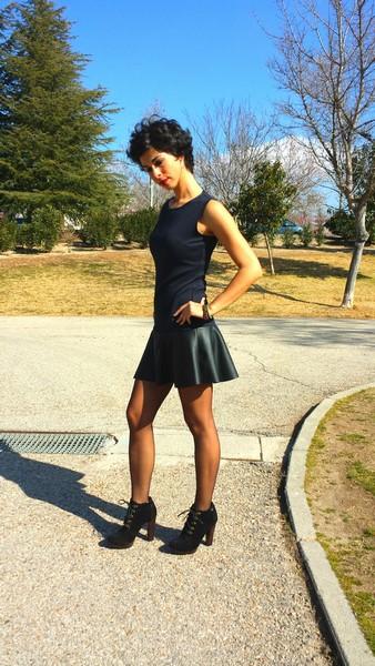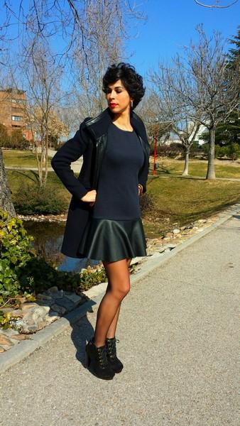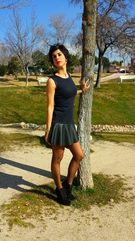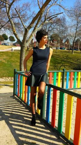 El vestido nada más verlo me encantó, con esta mezcla de falda de piel y top jaspeado en tonos negros y azules. ¡Qué le voy a hacer, me lo tuve comprar! Y encima en rebajas, ¿qué más se puede pedir?