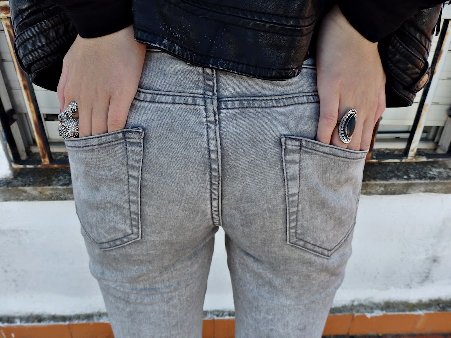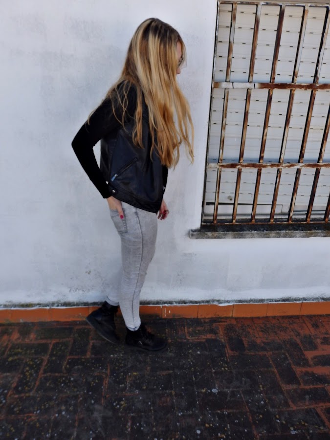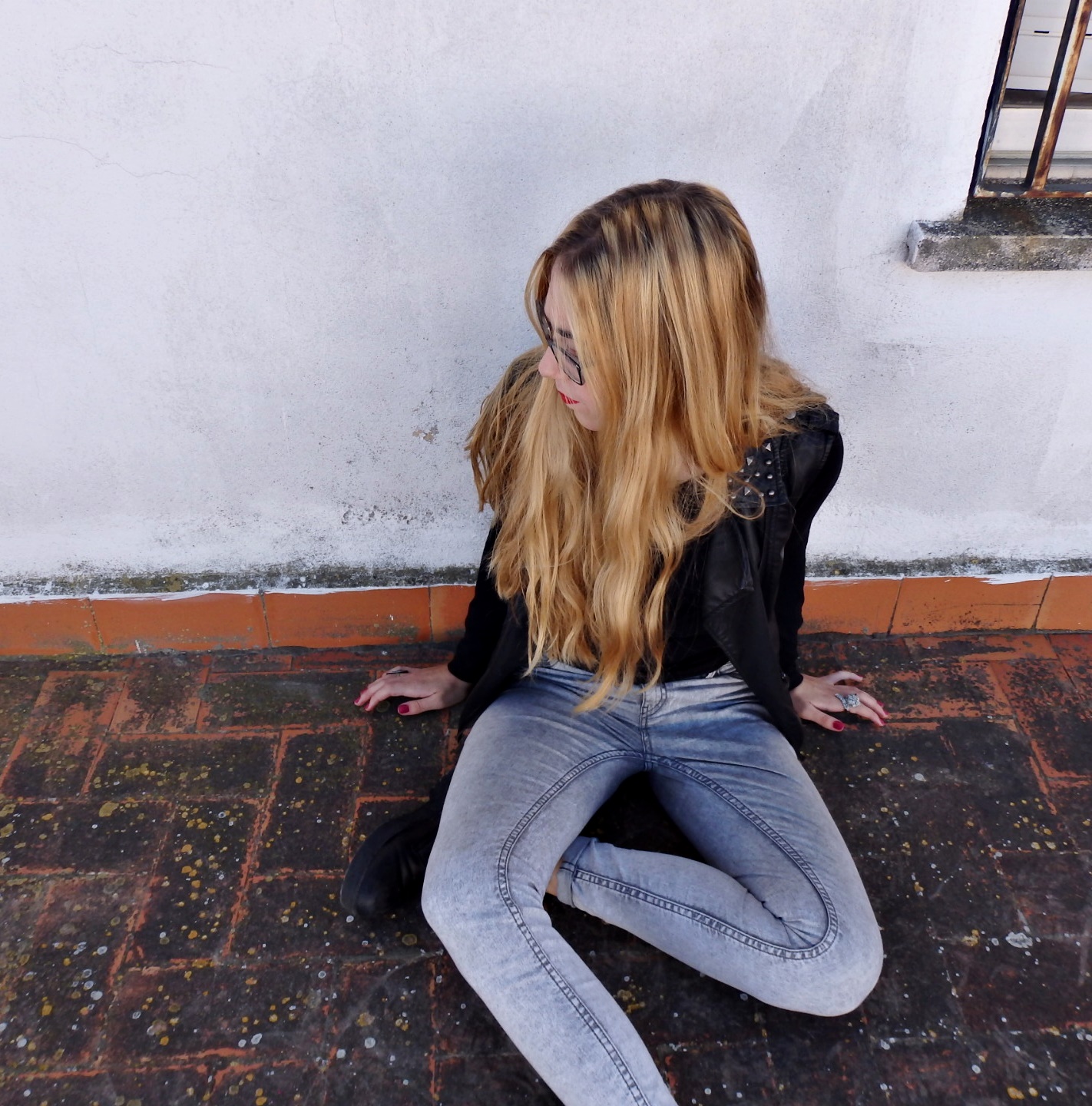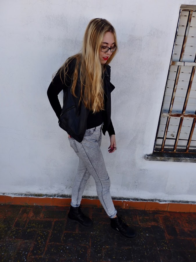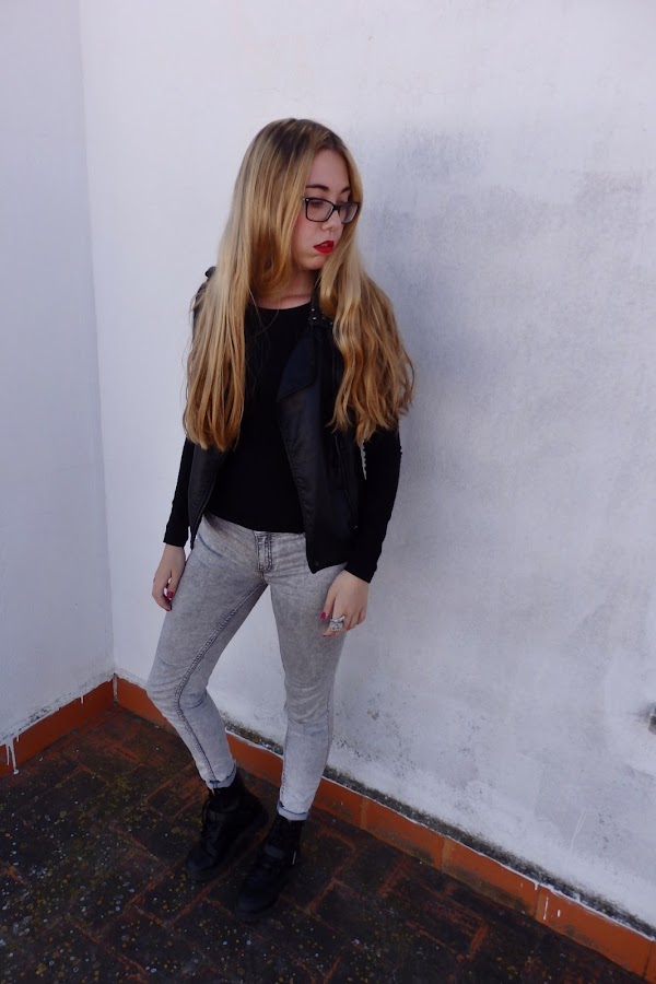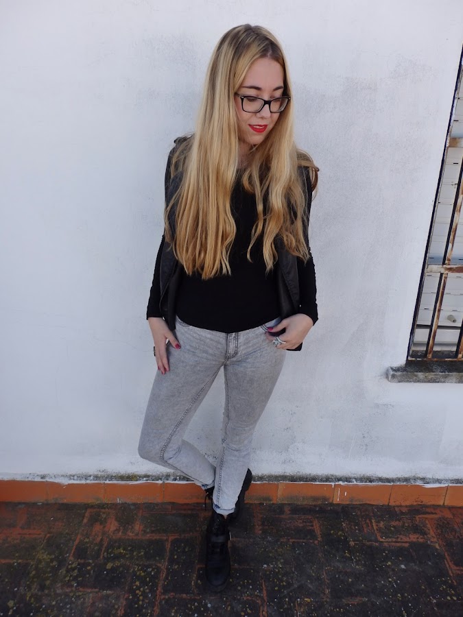 El outfit que os traigo hoy es en tono negro (como ya os habréis dado cuenta es uno de mis favoritos al vestir) y gris. Está compuesto por una camiseta básica negra y un chaleco de imitación al cuero con tachuelas también negro, esta última prenda es la que caracteriza al conjunto, y por eso he querido que la atención se vea centrada sobre ella. Como parte de abajo he elegido unos vaqueros en tono gris desgastado que rompen con el negro del resto de prendas; y unas botas estilo militar también oscuras.