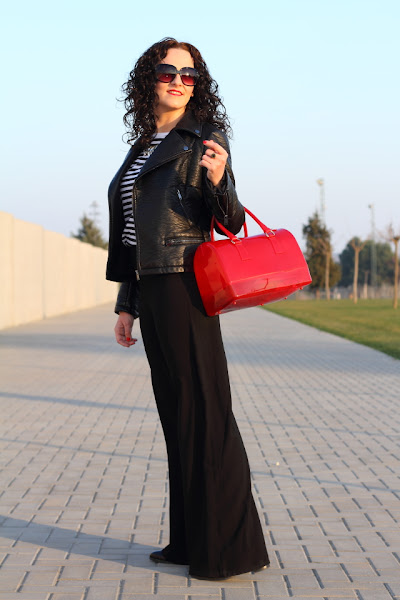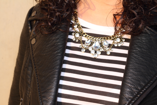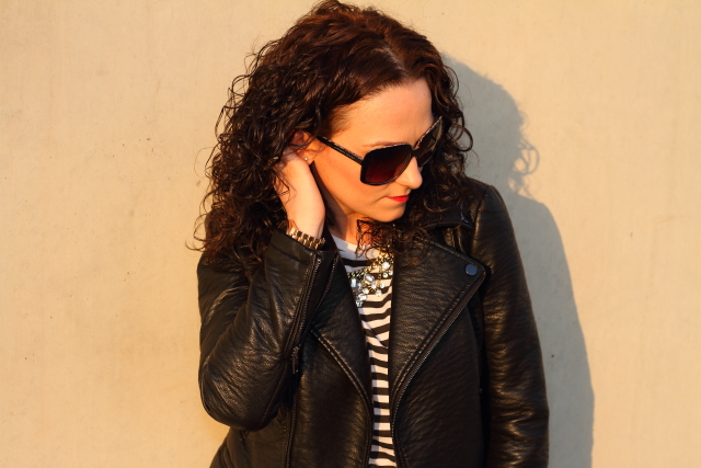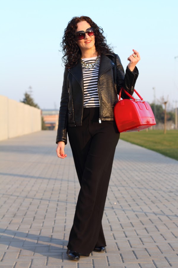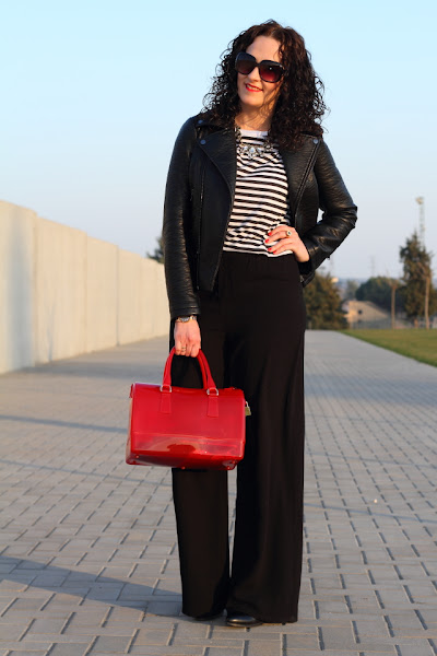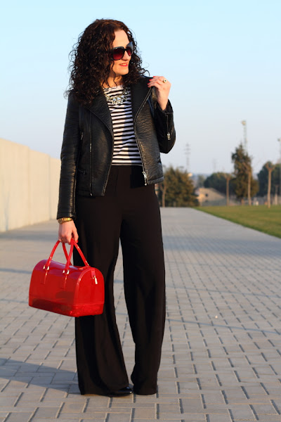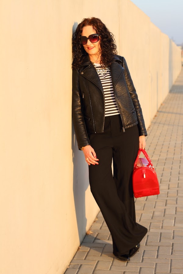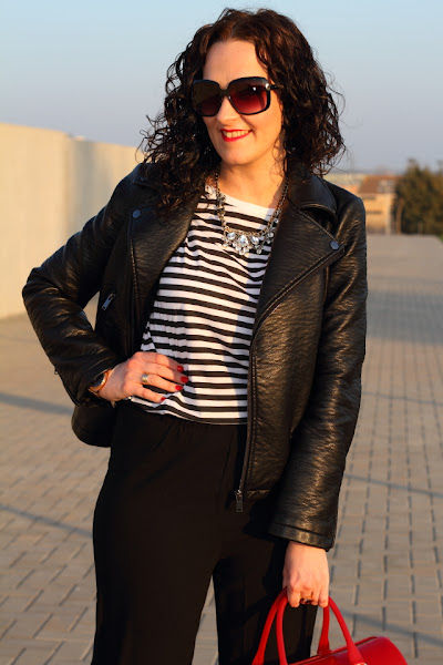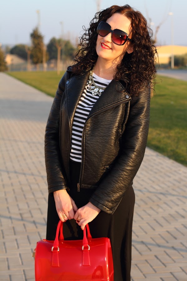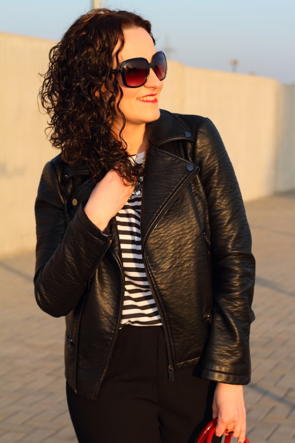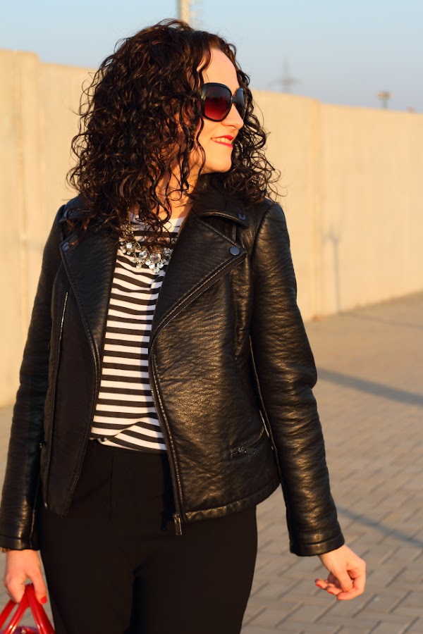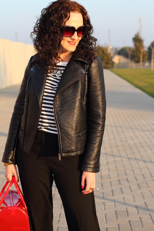Ayer, paseando con mi marido a última hora del día, pudimos disfrutar de una preciosa puesta de sol. Me encanta la luz que deja el sol cuando se va yendo, así que decidimos aprovecharla para hacer las fotos con el look que elegí para salir a pasear y tomar algo. Llevaba un outfit en tonos blancos y negros al que le di un pequeño toque de rojo en el bolso. Un estilismo compuesto por una biker, camiseta de rayas y pantalones palazzo. Pero lo que más me gusta del look es mi nuevo collar joya de Born Pretty Store, desde que me llegó es que no me lo quito porque va todo.