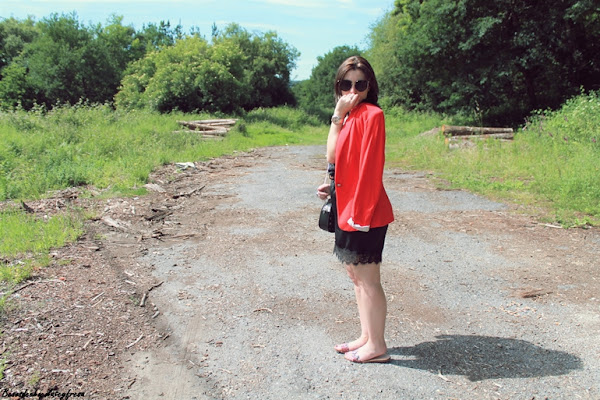 Completo el outfit con sandalias pala en rojo para romper la monotonía del negro y blazer para darle ese toque sofisticado y elegante.