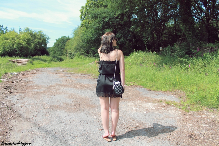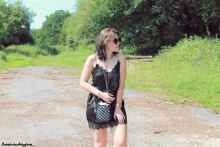 Cómodo y fresquito a pesar del color negro para los días de verano, que acompañé de un cinturón para marcar la cintura, aunque también se puede llevar suelto, dándole otro aire diferente al estilismo. Por otra parte otro de los protagonistas del look es mi nuevo bolso en forma de piña, cada vez son más los bolsos que vienen con figuras y este en tonos negros y blancos que combina con todo me pareció perfecto y divertido para darle un aire desenfadado a los looks.
