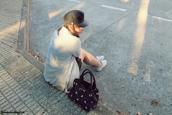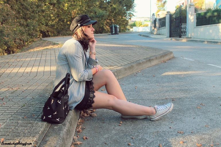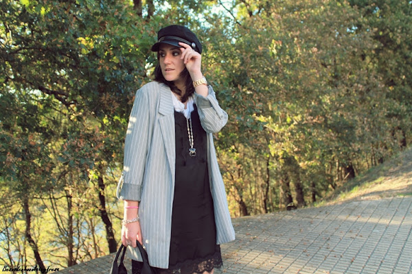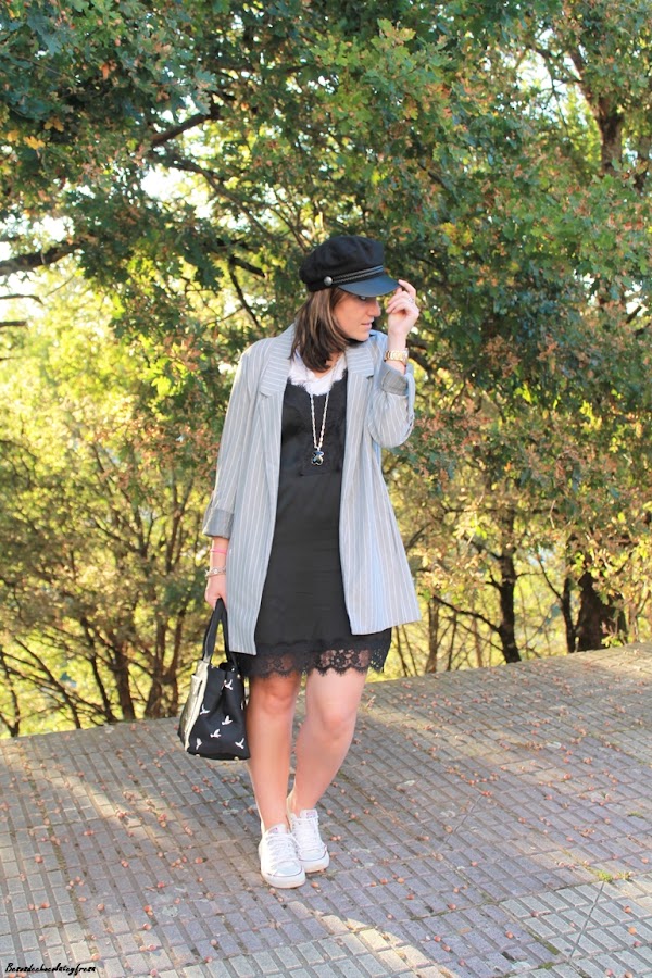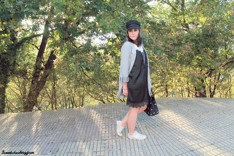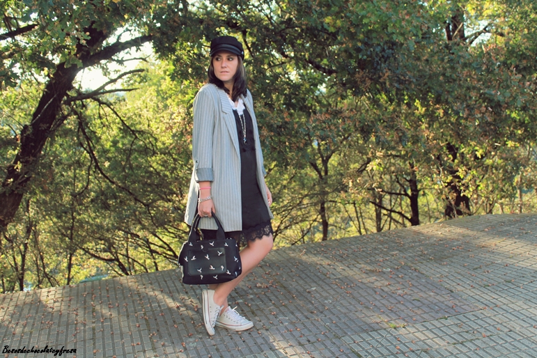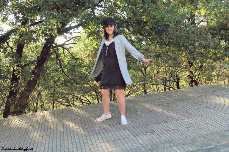 Completé el look con blazer de corte oversize en gris del traje dos piezas, al que se le puede sacar mucho partido por separado, converse, bolso en negro junto con el collar, y gorra del mismo color que me parece que le da un rollo diferente y original al look.