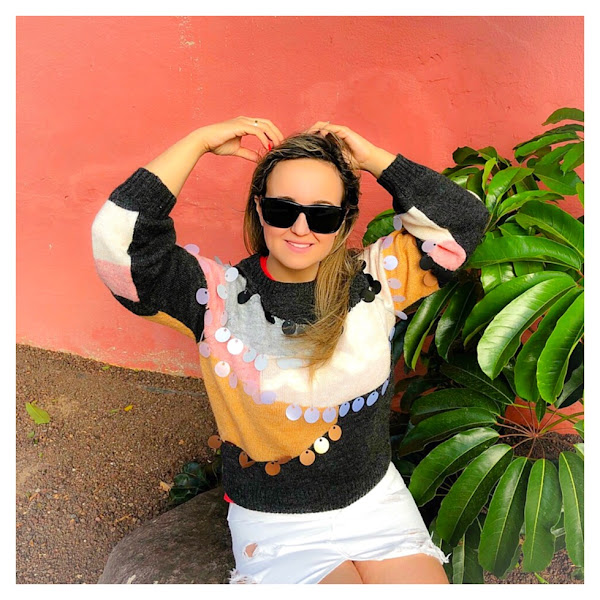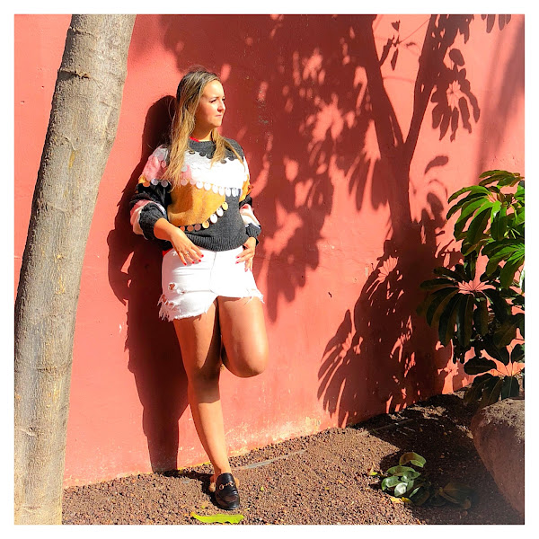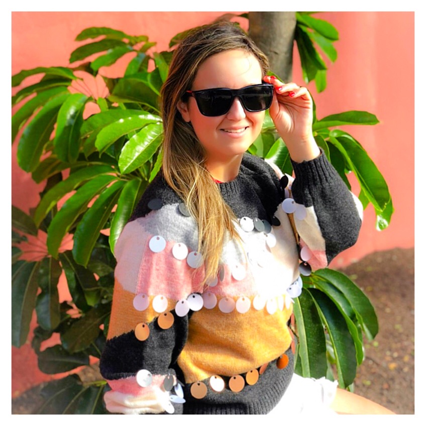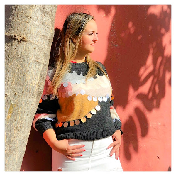Hoy os traigo un look protagonizado por un precioso jersey de lentejuelas de color rosa, beige y gris de Hola Accesories que me enamoró en cuanto lo vi. Yo lo he combinado con una minifalda vaquera en blanco y loafers negros con pelo de Gucci, pero tiene un montón de opciones porque es espectacular.
