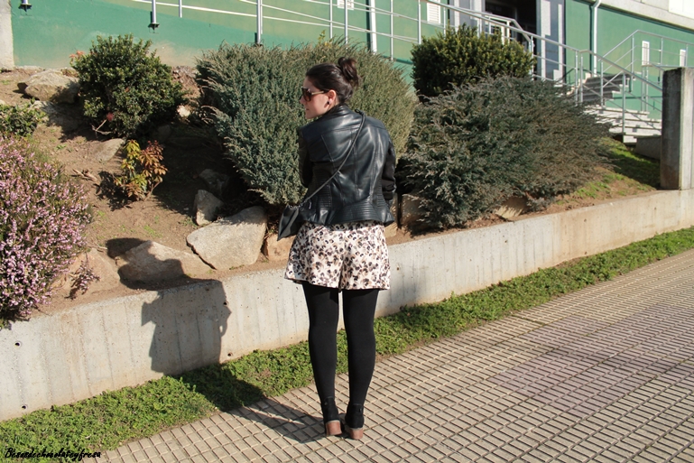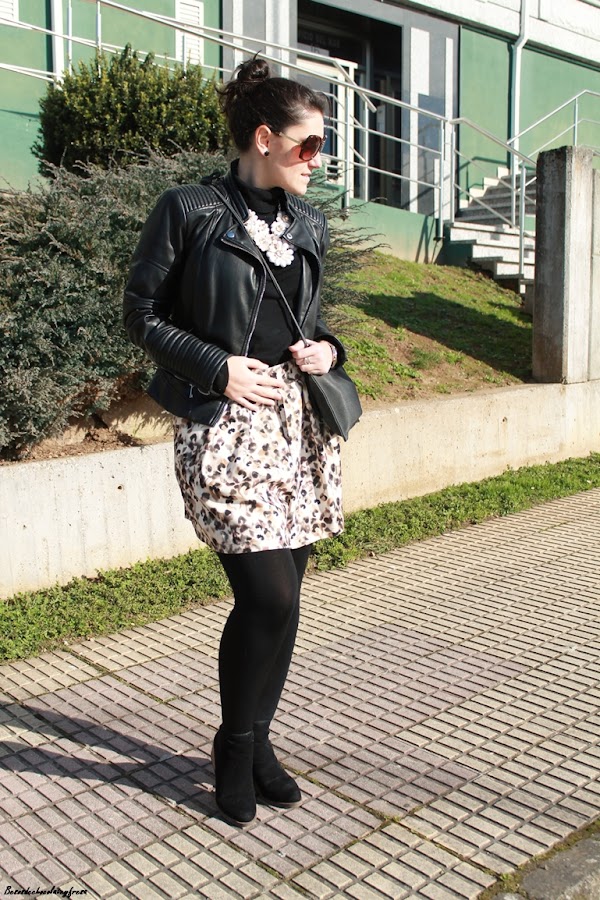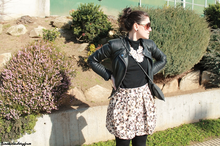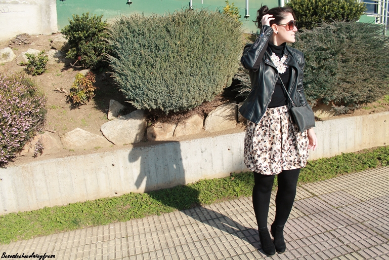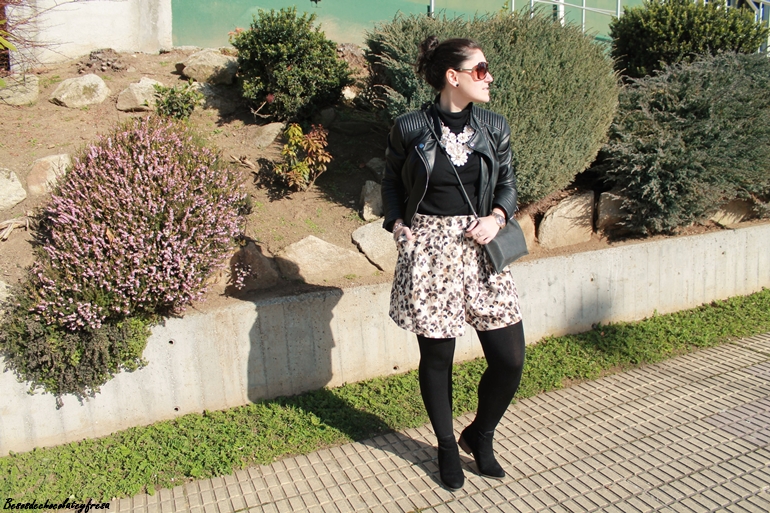 This time I decided to combine them with black stockings in black, swan-neck sweater, biker, booties and shoulder bag all in black and as accessories maxi flower necklace in nude another of the colors that prevails in shorts. What do you think?