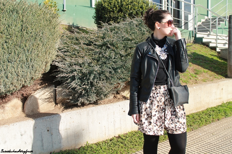 Esta vez decidí combinarlos con medias polares en negro, sweater de cuello cisne, biker, botines y bolso bandolera todo en negro y como complementos maxi collar de flores en nude otro de los colores que predomina en los shorts. ¿Qué os parece?