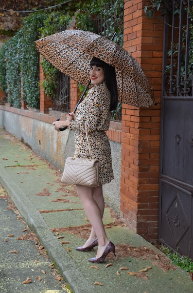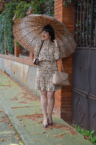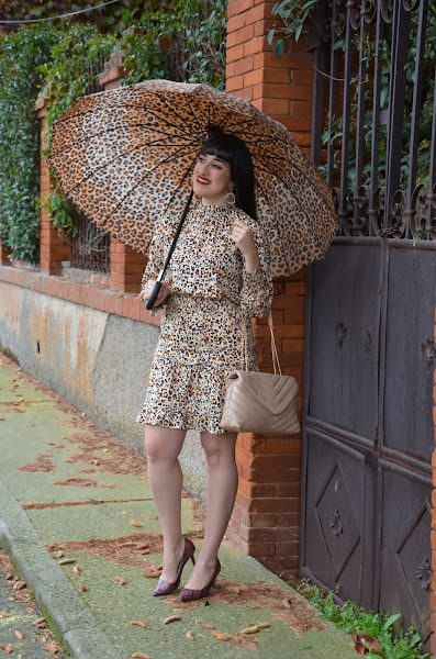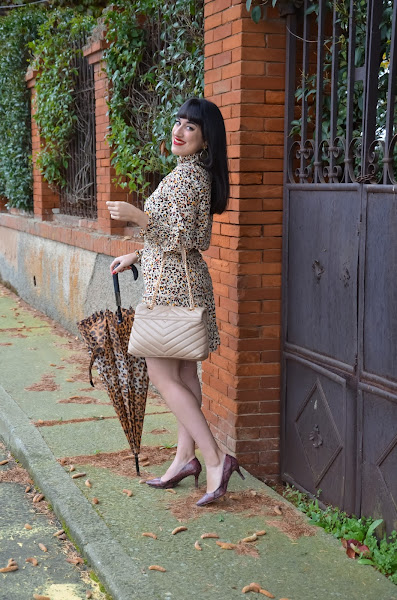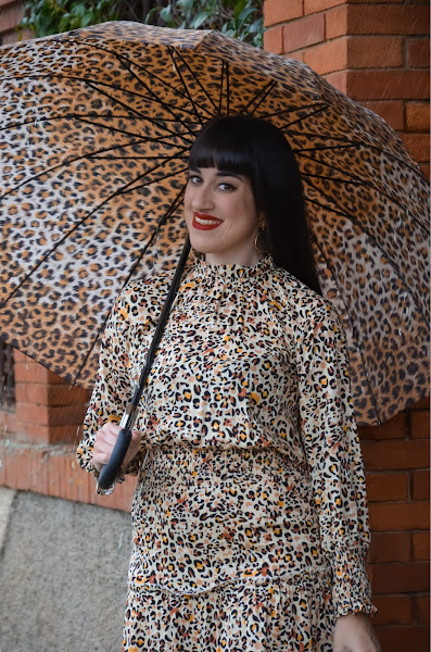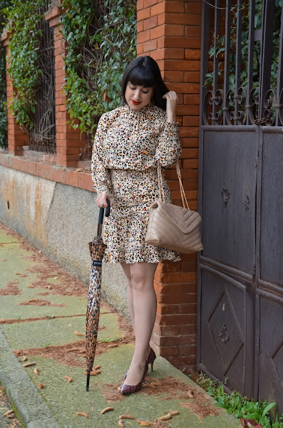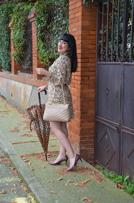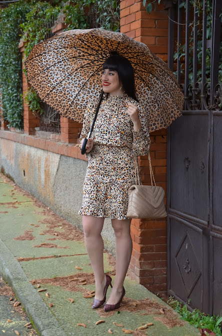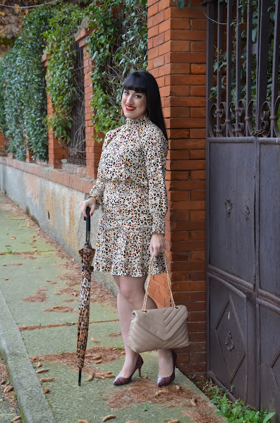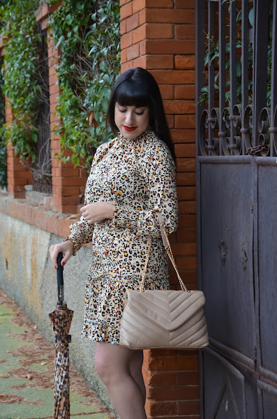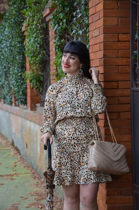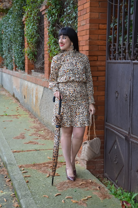 Hoy os enseño este total look con animal print que tiene por protagonista este vestido de Soulmia con cuello alto, manga abullonada, puños y volantes. Sienta espectacular, y a pesar de que aún estoy recuperando mi figura después de la operación, me siento favorecida con el, estiliza un montón la figura.