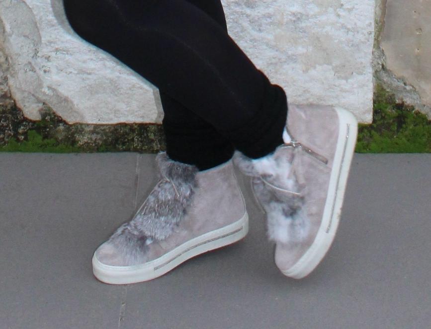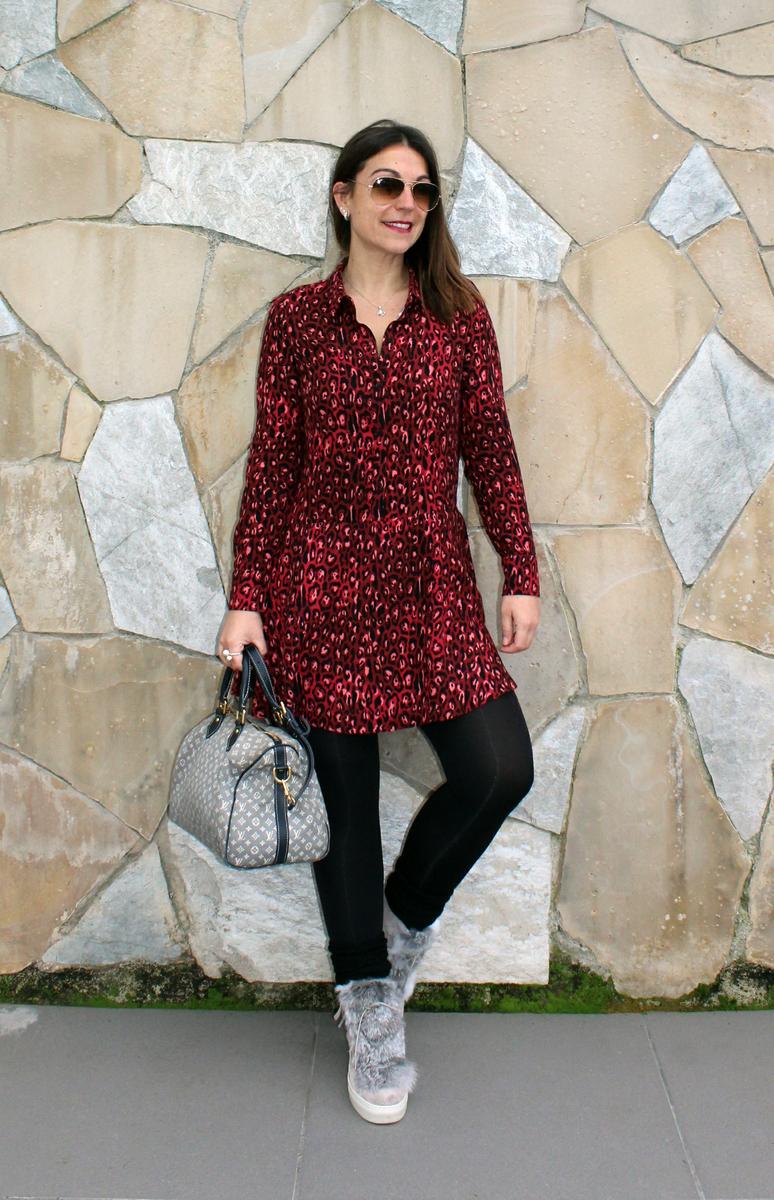 Llevo un vestido estilo camisero con vuelo en la parte baja con un print de leopardo en tonos rojos y negros, abrigo en gris combinado con una zapatillas de pelo del mismo tono y calcetines tipo calentadores al más puro estilo ochentero, que aunque en un principio el uso de esta prenda era la de las piernas, llegaron a convertirse en un accesorio básico en la época.