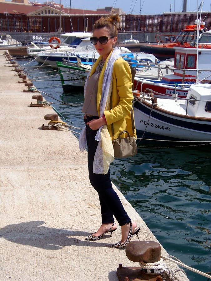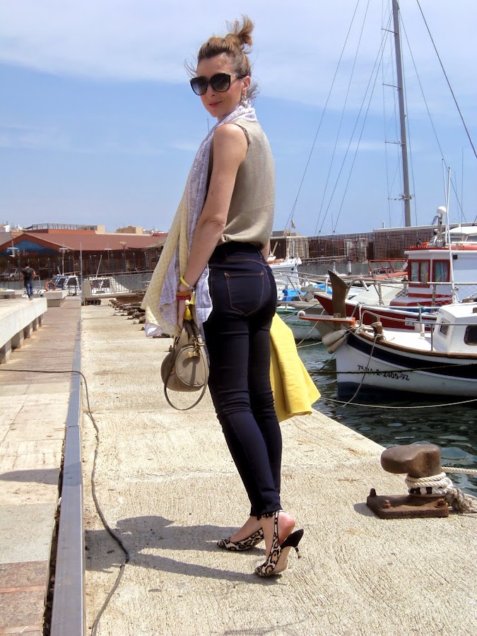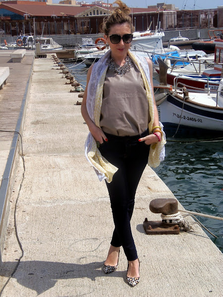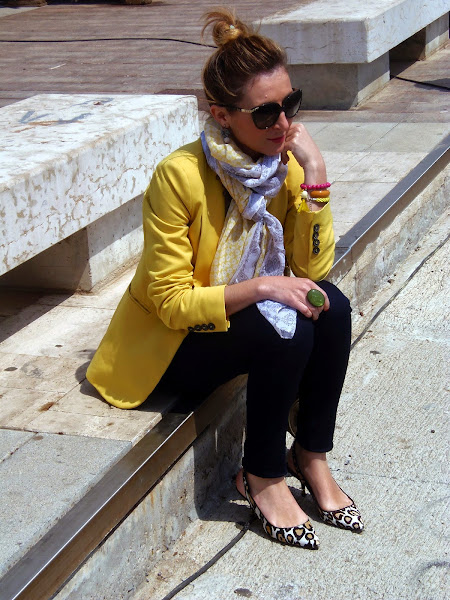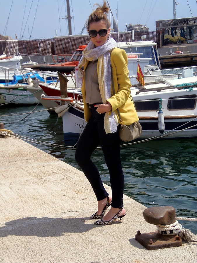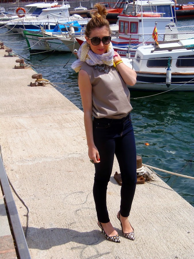 El look de hoy es súper sencillo, es el típico que nos saca de los apuros cuando no sabemos que ponernos y queremos ir monas. Lo que más me gusta de este look es la combinación de amarillo y leopardo, me parece una mezcla que queda a la perfección, además le da mucha luz al look. El top es precioso tiene diferente textura por delante que por detrás, aunque en las fotos nos se aprecia. Y como toque final una pañuelo que compre en una tienda local de la pineda que tiene unos colores y un tacto que es maravilloso.