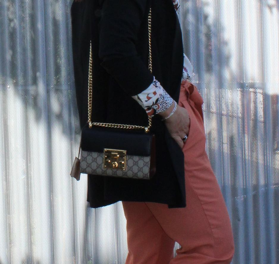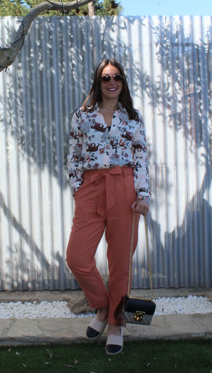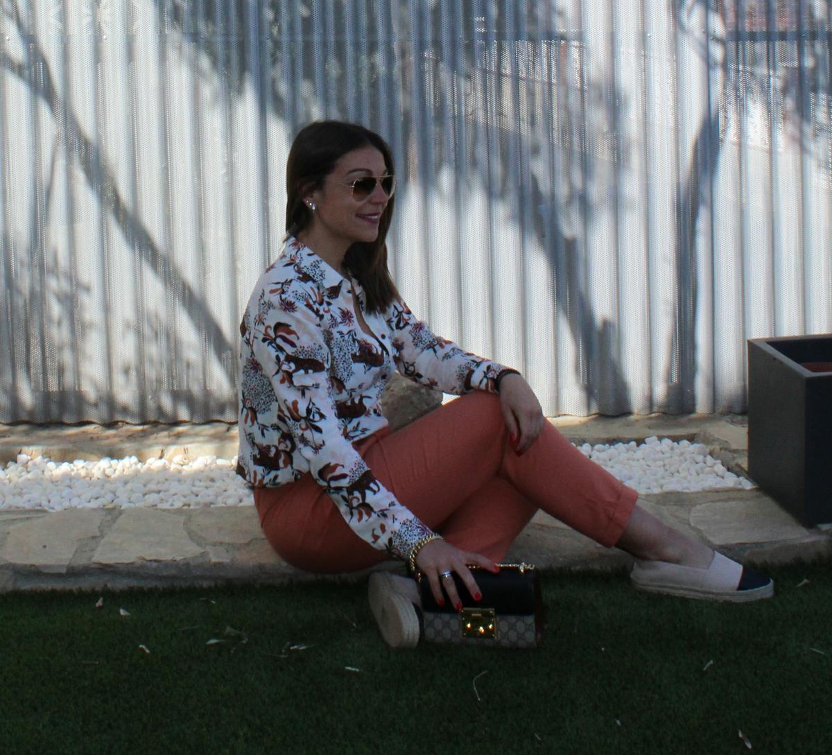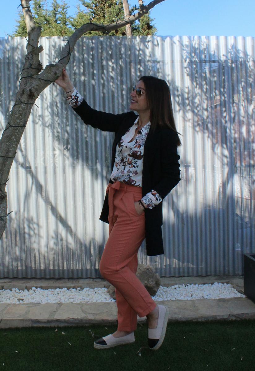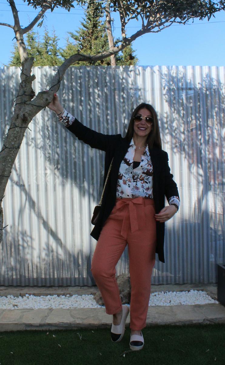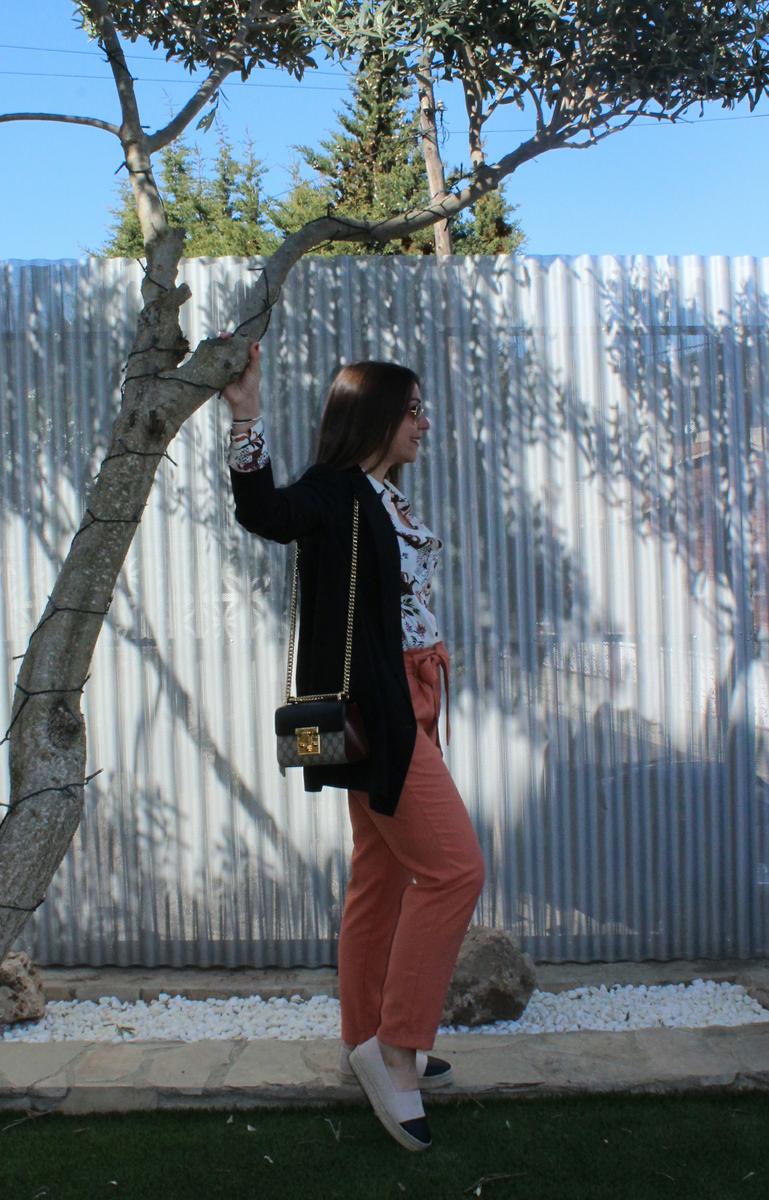 En mi look de hoy no elegí diferentes prints, pero si jugué con los tonos de la camisa muy similares al salmón del pantalón tipo papebag. Combinado con un blazer extralargo en color negro y espardeñas inspiración chanel.