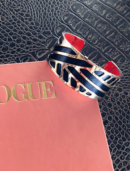 En mi caso, me decanté por un brazalete con un ancho medio en dorado y con la banda de cuero en color coral liso por un lado y un azul muy oscuro casi negro metalizado por el otro. Creo que el resultado es muy elegante, muy adaptable y muy chic, ¿no os parece?