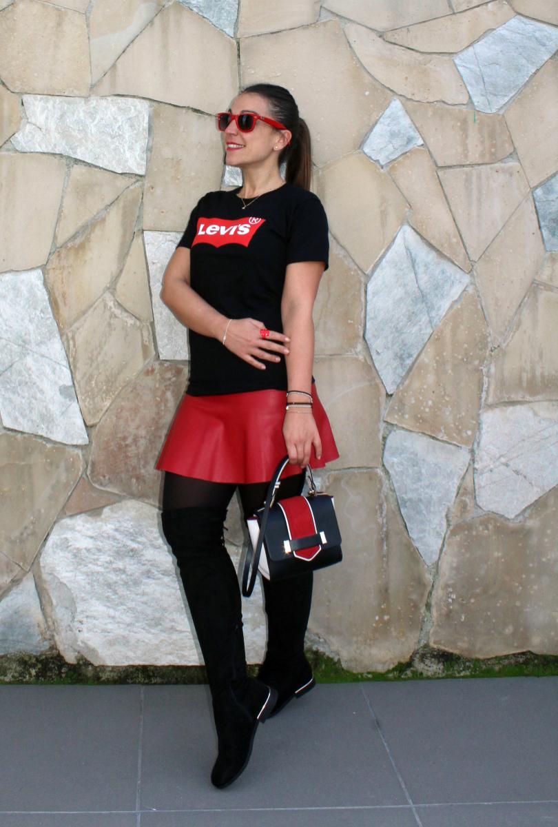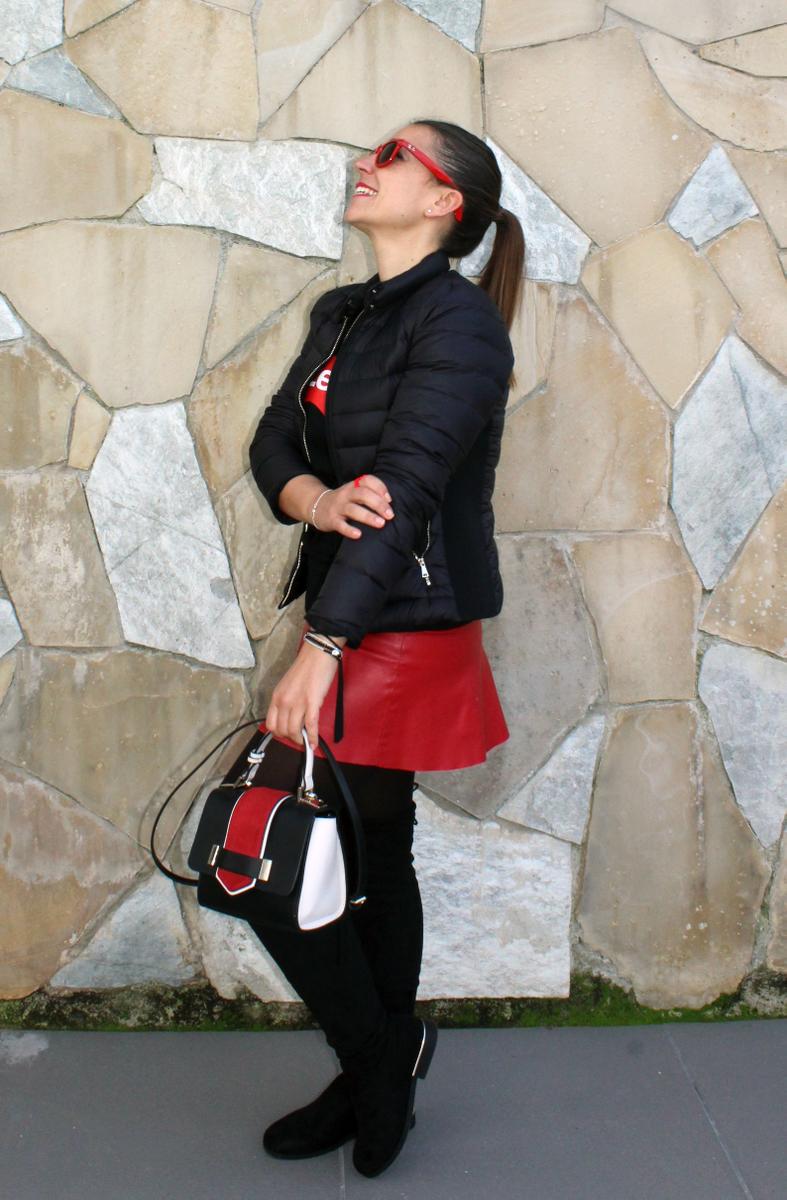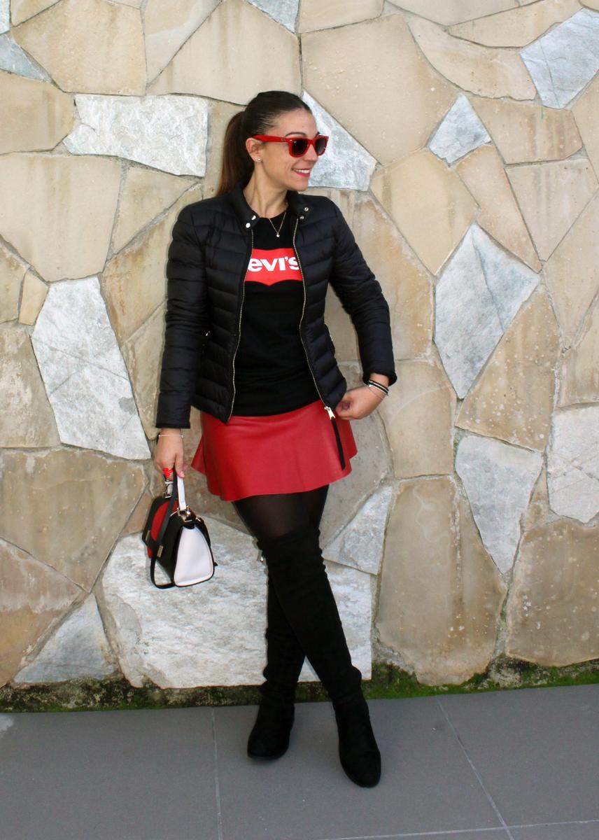 Un outfit muy sencillo, camiseta negra con logo en rojo combinado con la falda de polipiel, botas overknee y cazadora bien acolchadita para suplir la manga corta