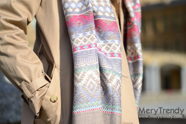 Una preciosa pashmina multicolor, confeccionada en un tejido maravilloso, que la hace suave al tacto... muy amorosa; un original colgante-libélula articulado; un maxi-anillo dorado con forma de estrella de mar; unos vistosos pendientes, también en dorado y con piedras en rosa, a juego con las tonalidades de la pashmina y una blusa de rayas en azul y blanco con detalle de bordados, muy fresquita e ideal de cara a la primavera.