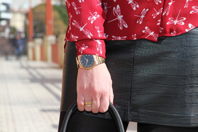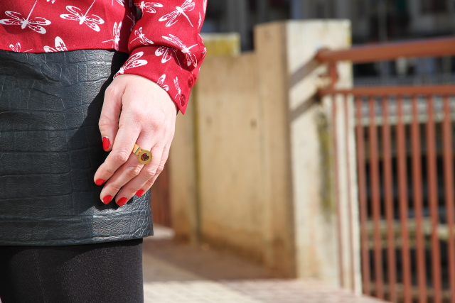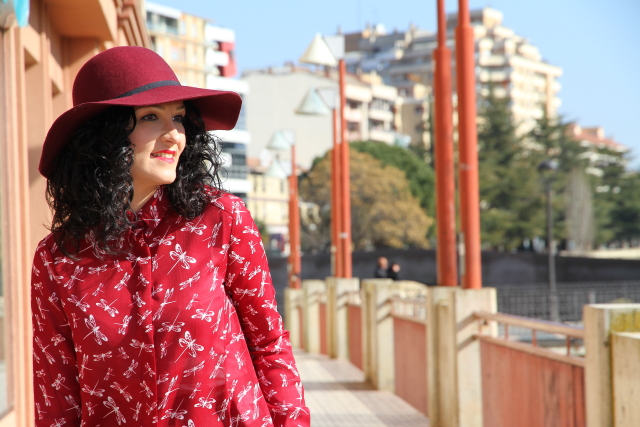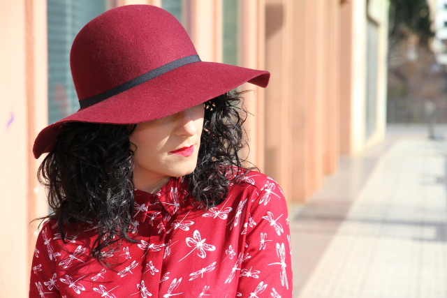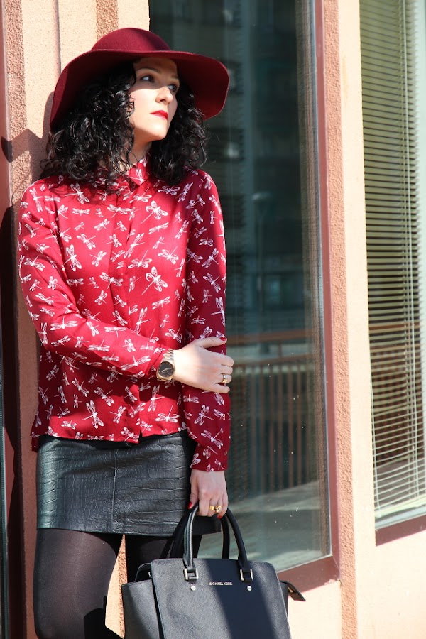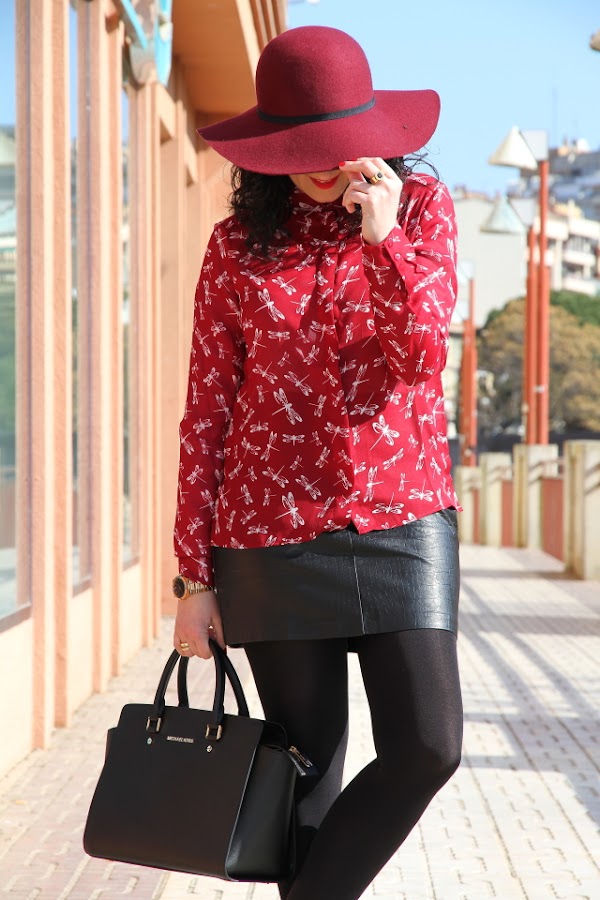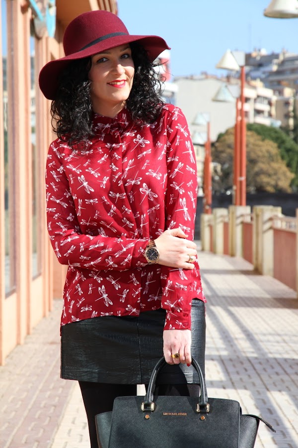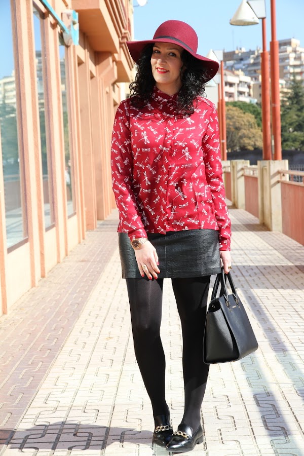 Esta blusa con estampado de libélulas me la compré al principio de las rebajas y todavía no la había estrenado, la verdad es que la había guardado y ya ni me acordaba de ella. Hace tres domingos pensado que ponerme la vi y enseguida monté un look en base a ella con una falda de polipiel negra, fedora granate y zapatos masculinos.